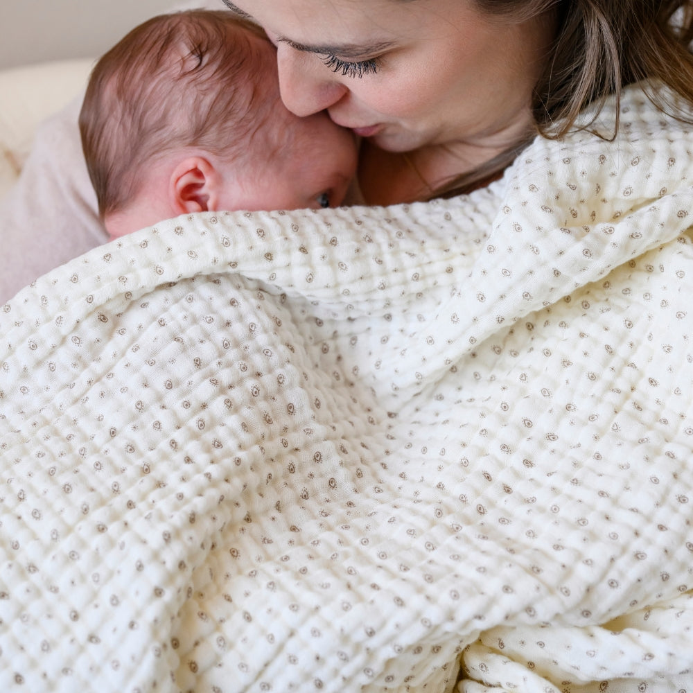 Pătura din bumbac este realizată din 4 straturi de bumbac organic aerisit, certificat GOTS, ceea ce o face delicată pe piele și plăcută la atingere.