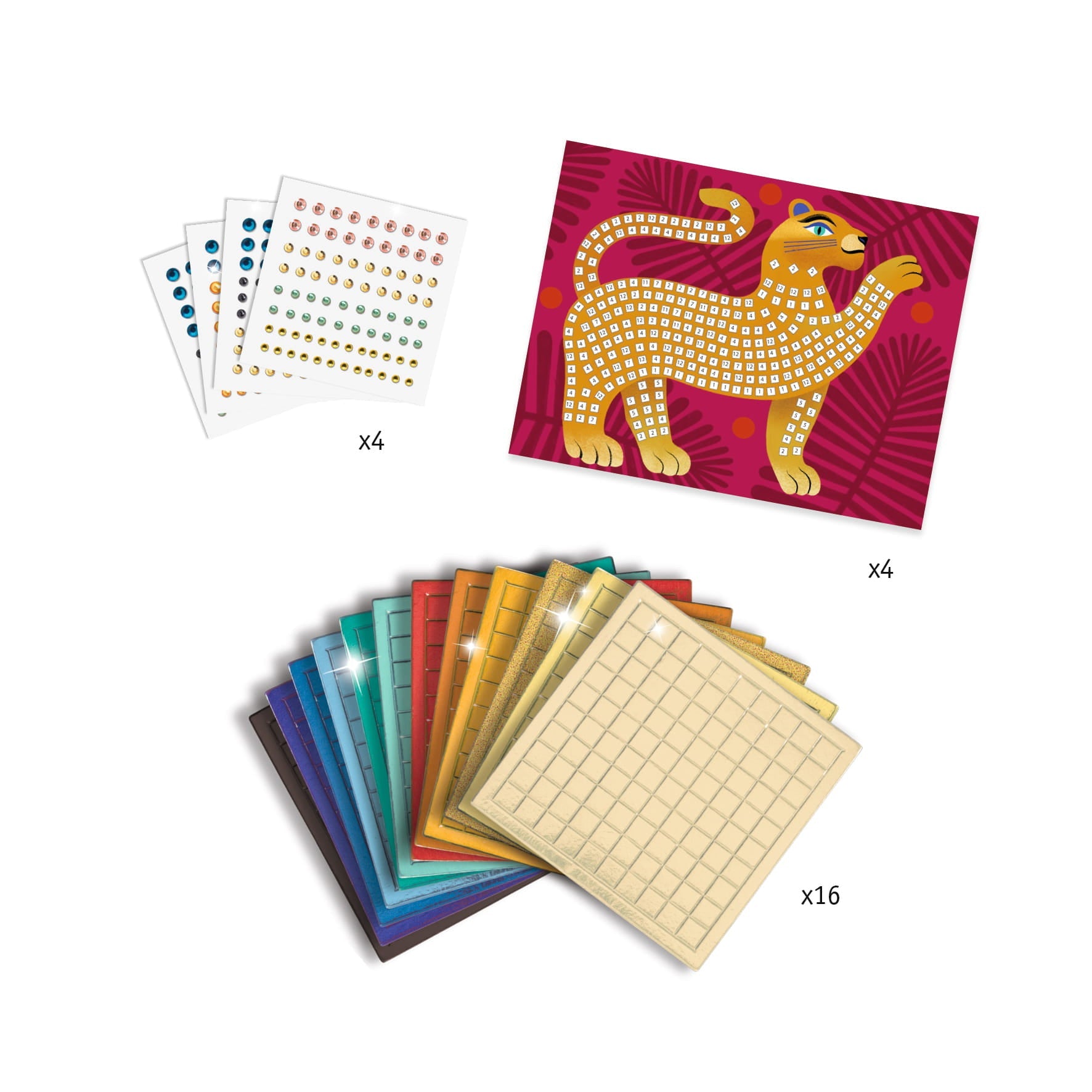 - Conținutul setului: 4 șabloane, 16 planșe cu mozaicuri din spumă și sclipici, 4 foi cu zirconii