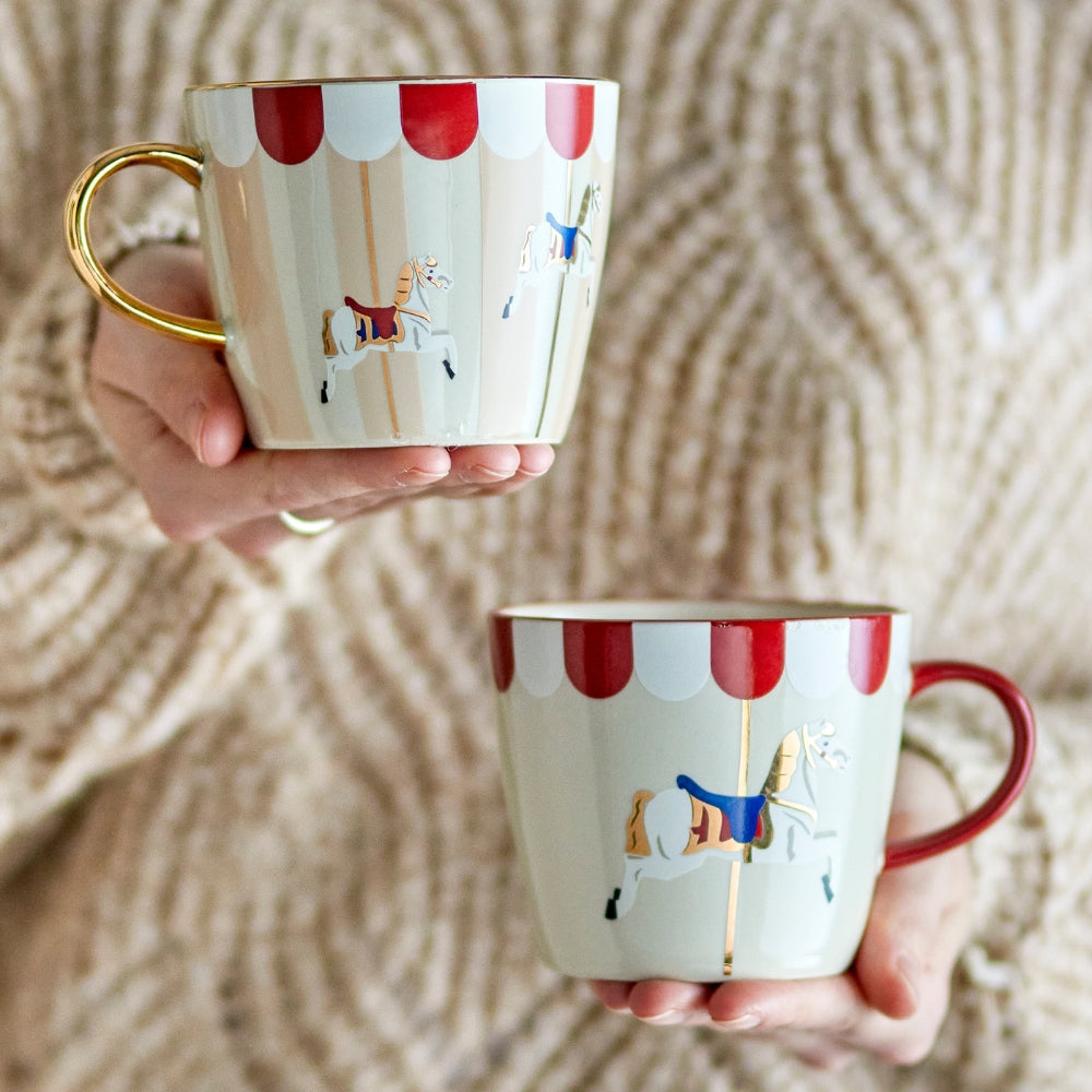 Fiecare cană de cafea a fost decorată cu un motiv de carusel, iar detaliile pictate manual fac fiecare piesă unică.
