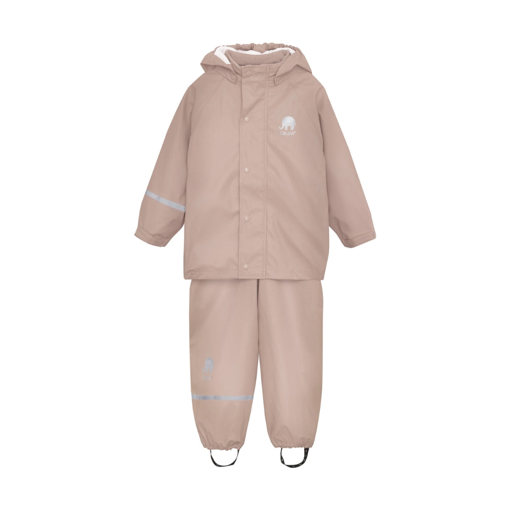 Pantaloni de ploaie pentru copii și jachetă de ploaie pentru copii în roz deschis de la CeLaVi mărimea 110 cm.