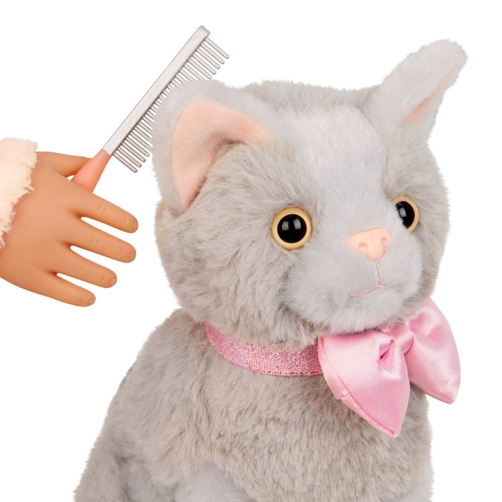 - Conținutul setului: Păpușă de 46 cm cu pistrui, bluză din pluș cu motiv de pisicuță, fustă din brocart plisată în roz deschis, colanți cu desenul unei pisicuțe pe genunchi, lenjerie intimă, pantofi, pisicuța din pluș Sammy, accesorii pentru îngrijirea pisicuței