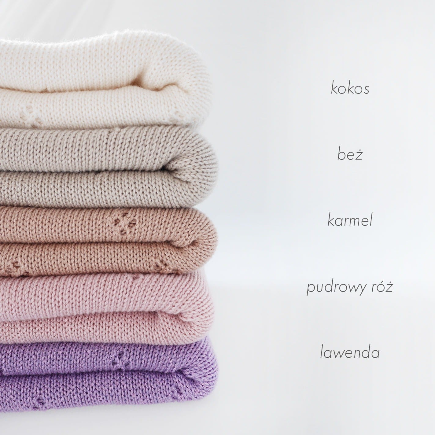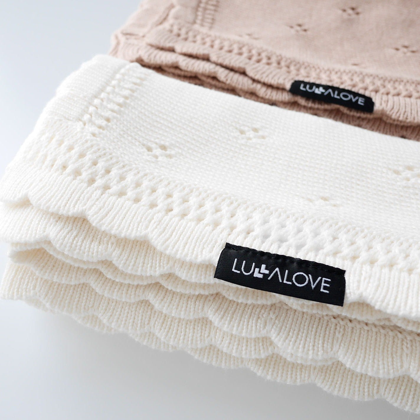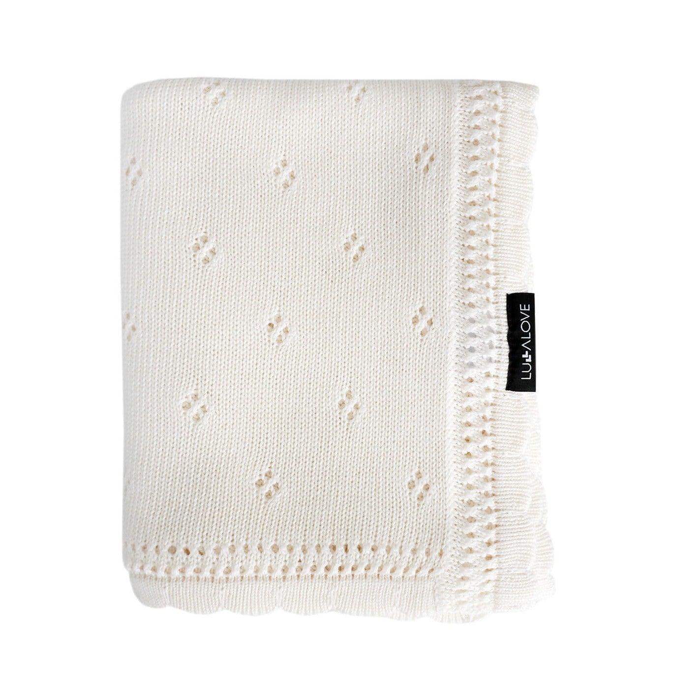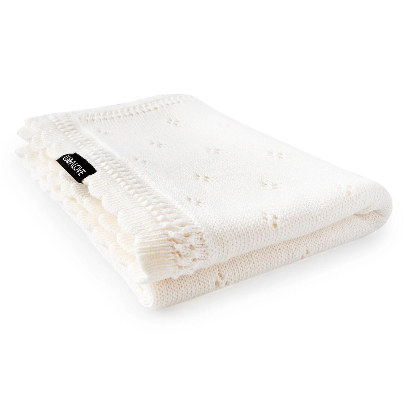 Drăguță pătură pentru bebeluși openwork daisy coconut într-o nuanță moale de alb de la Lullalove.