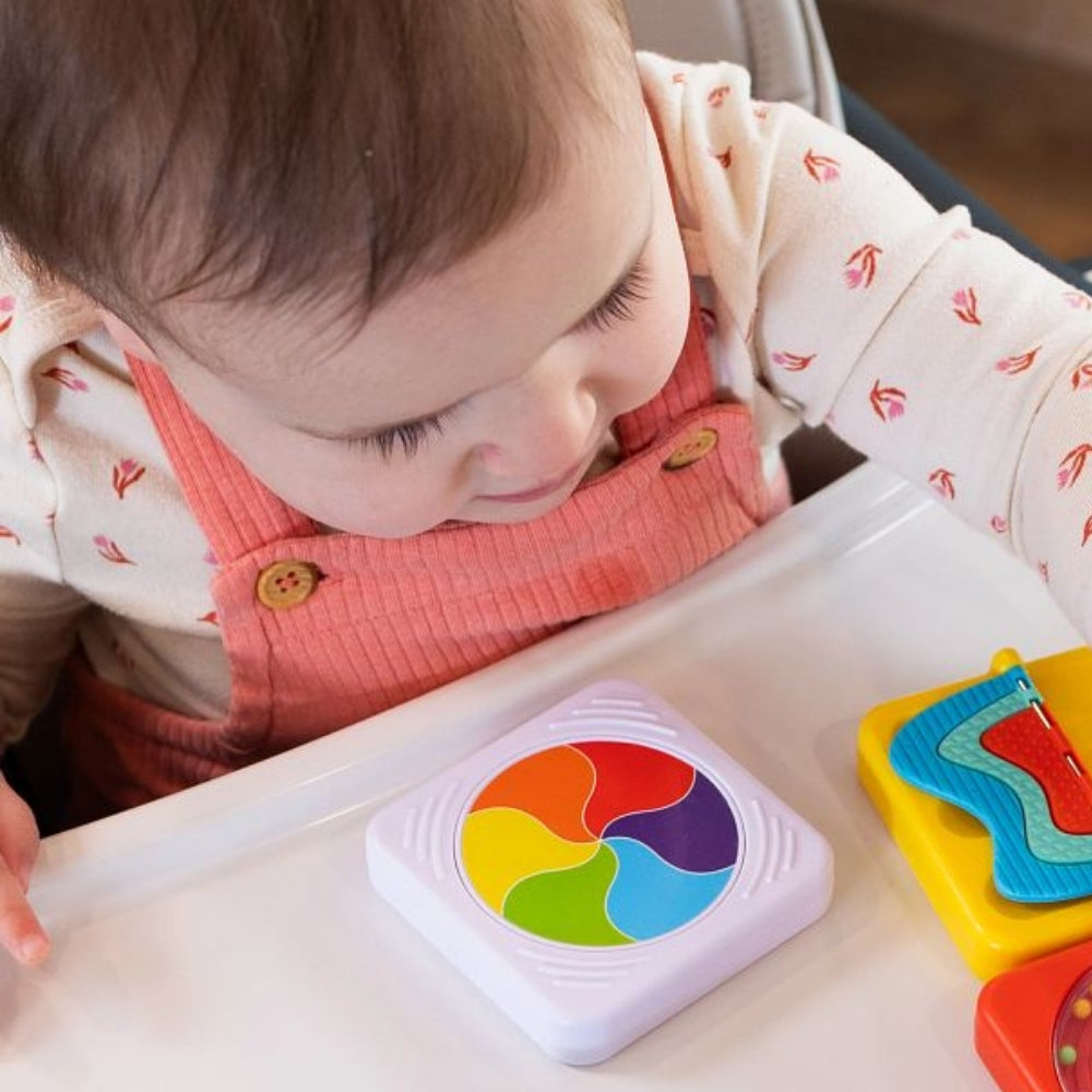 Pătratul senzorial de la Fat Brain Toys este o jucărie captivantă care atrage atenția bebelușului cu cadranul său colorat în mișcare și încurajează explorarea cu mâinile.