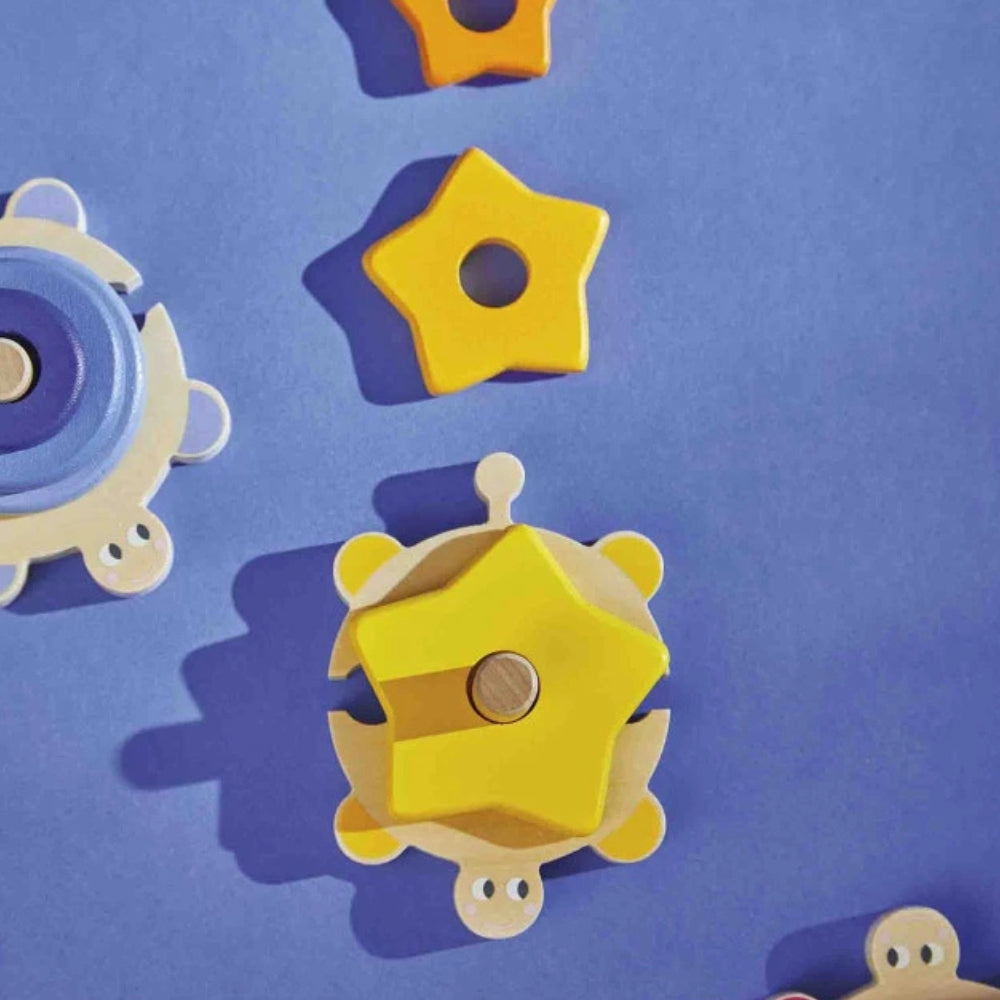 Fiecărei țestoase îi sunt alocate 3 piese pentru a le stivui, astfel încât copilul învață ordonarea și potrivirea într-un mod distractiv și intuitiv.