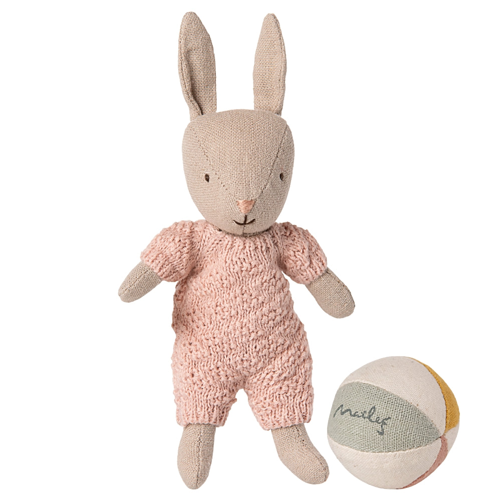 Setul include o minge mică și un iepuraș moale de dimensiuni micro.