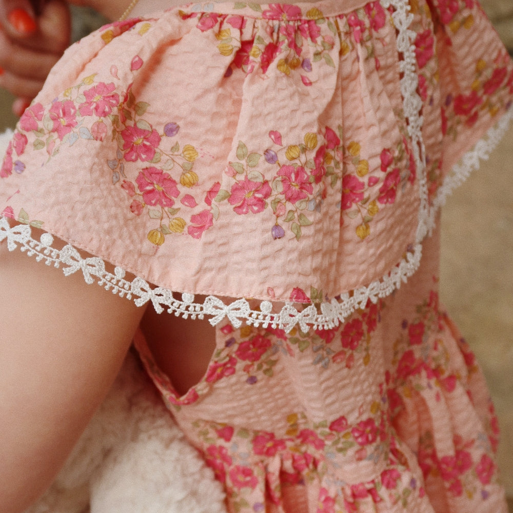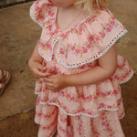 Această rochie pentru fete de la Konges Slojd este o alegere unică pentru micile iubitoare de stil. Concepută cu atenție la detalii, se remarcă prin straturile decorative de volane care adaugă farmec și lejeritate.
