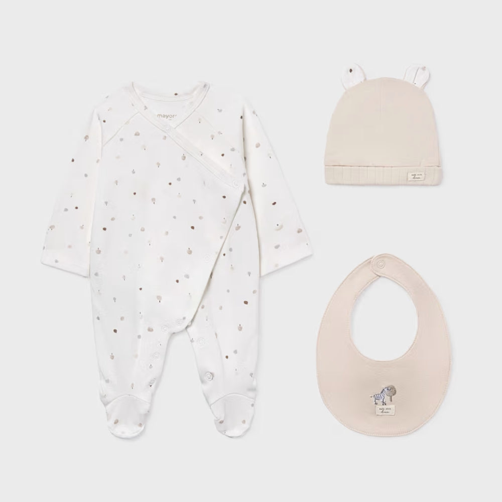 Este alegerea perfectă pentru un baby shower, nașterea unui copil sau orice altă ocazie specială. Setul cadou pentru bebeluși de la Mayoral conține trei articole esențiale: un costum de dormit delicat, o pălărie și o bavetă - tot ce are nevoie un nou-născut pentru un somn confortabil și liniștit.