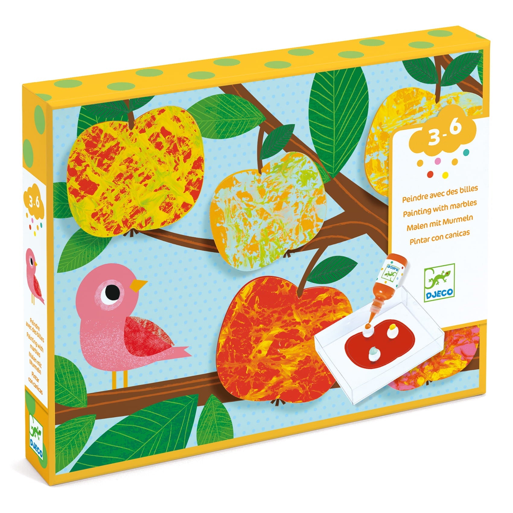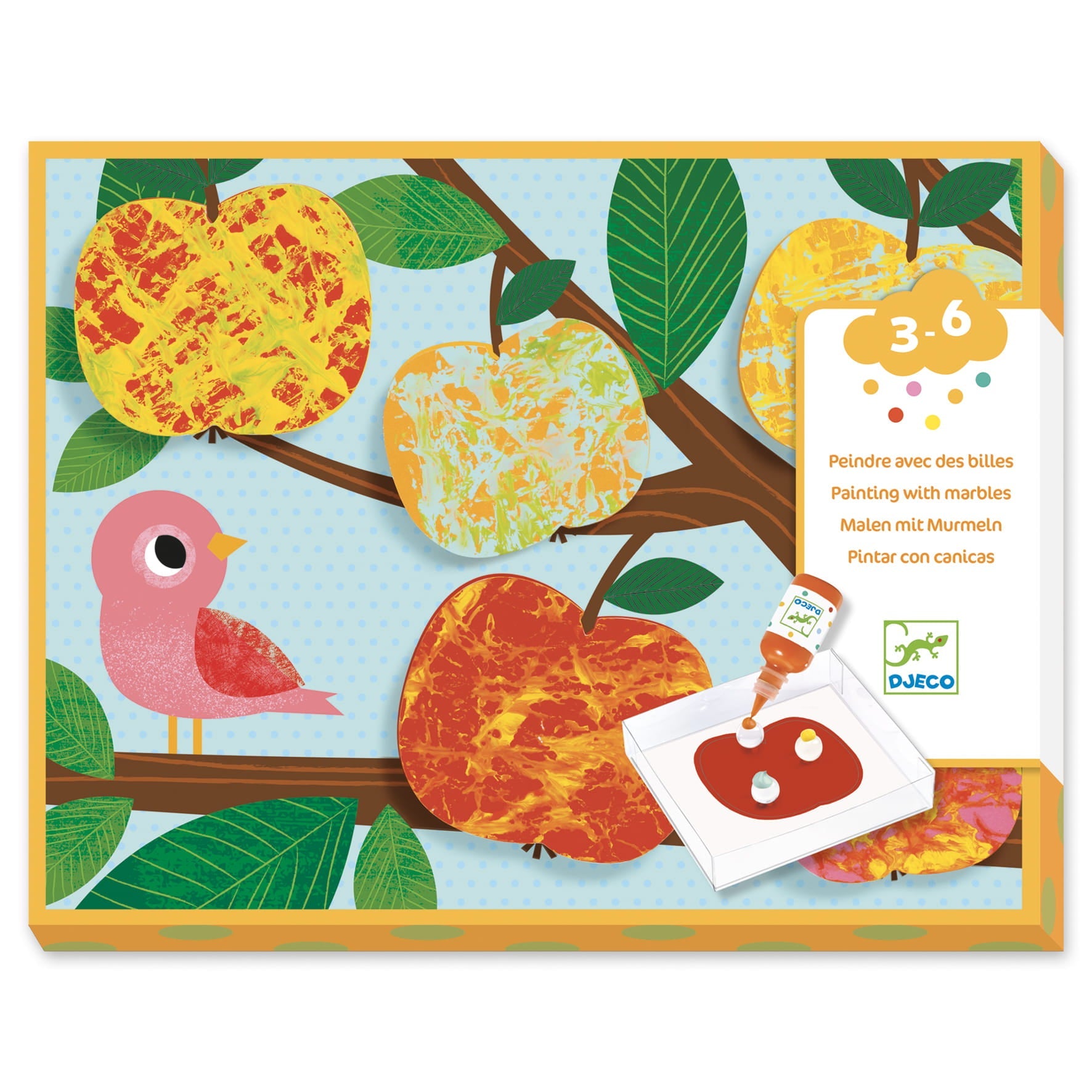 Setul de artă Djeco este o idee excelentă pentru jocul creativ în care copilul creează imagini într-un mod neobișnuit - pictând cu bile de sticlă și vopsele.