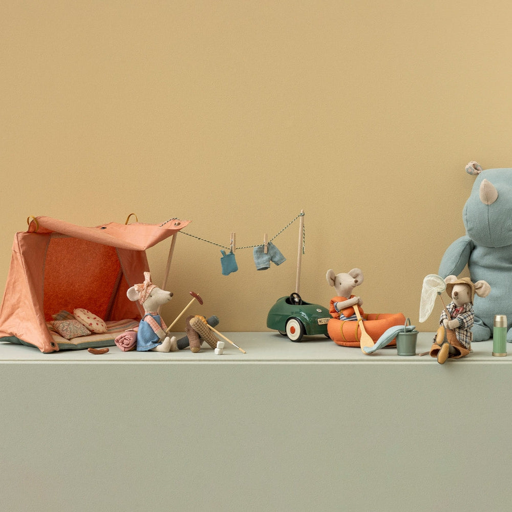 În timpul expedițiilor și excursiilor cu cortul, personajele din lumea Maileg pot sta în jurul focului de tabără și pot pregăti mesele împreună, dezvoltând imaginația și creativitatea copiilor.