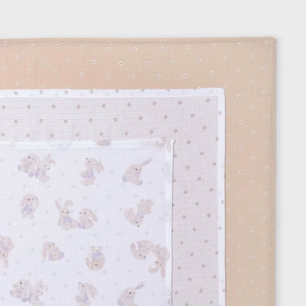 Setul include trei scutece moi și delicate, realizate din bumbac 100%, ideale pentru pielea sensibilă a bebelușului.
