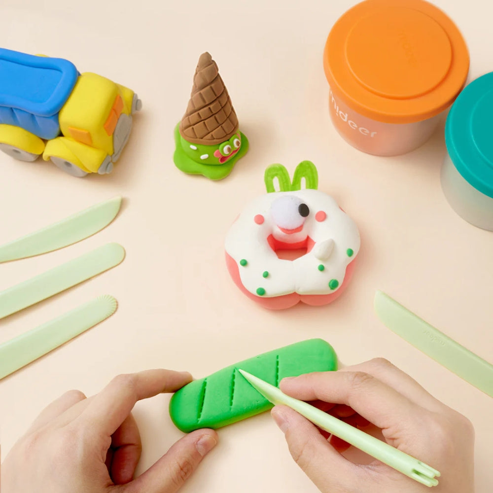 Setul include unelte de modelare - spatule și cuțite sigure cu vârf perforat - pentru a adăuga un plus de varietate distracției.