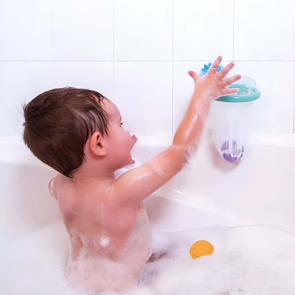 Setul este format dintr-un coș moale cu plasă, care poate fi fixat pe cadă sau pe gresia netedă a băii cu ajutorul ventucilor, și trei mingi colorate. Culorile intense - portocaliu, turcoaz și violet - și textura variată a mingilor stimulează și mai mult simțul tactil, făcând ca timpul băii să fie și mai interesant.