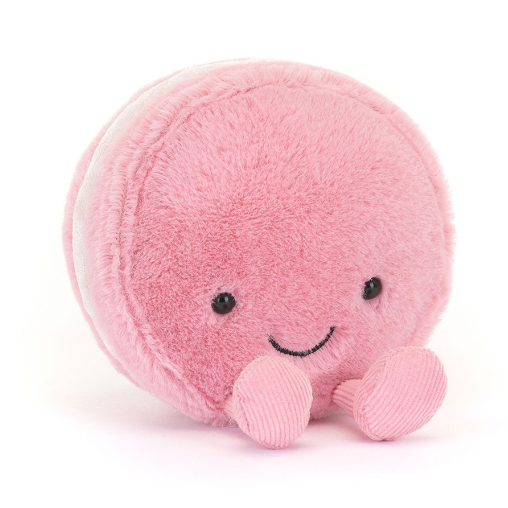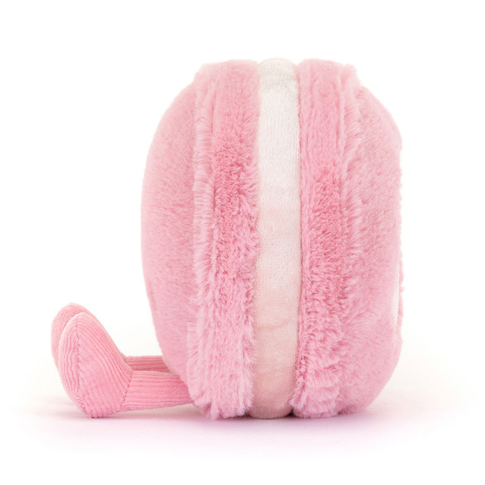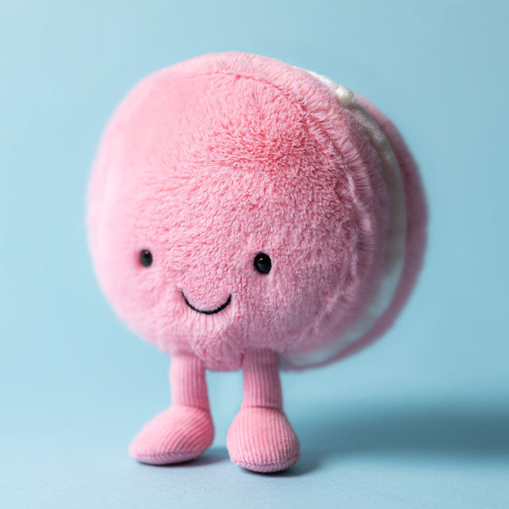 Jellycat a avut grijă de detalii: fața zâmbitoare, culoarea macaroanelor și țesăturile plăcute la atingere.