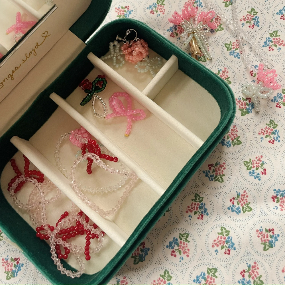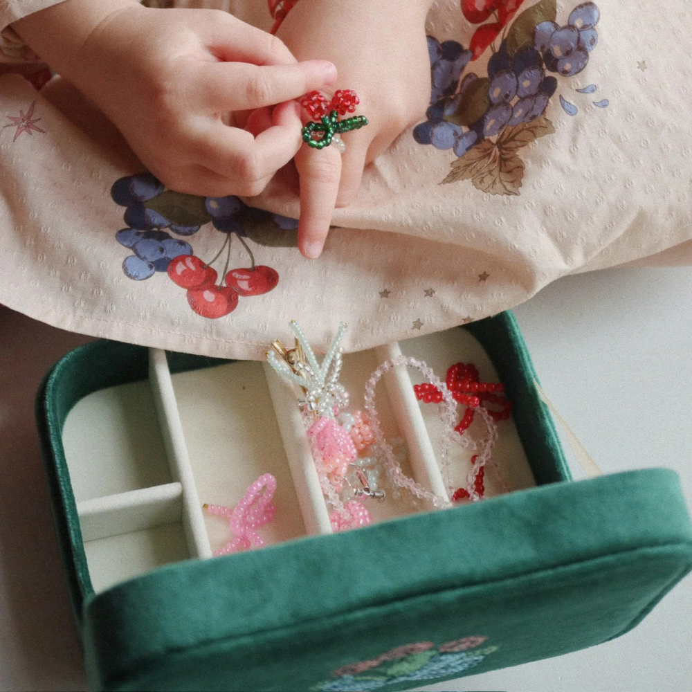 Cutia de catifea ascunde comori perlate care îi vor încânta pe micuții iubitori de vestimentație și joacă de-a casa.