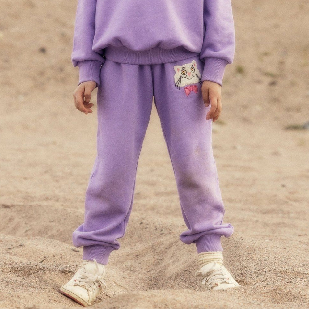 Pisică cu papion Pantaloni de trening violet pentru copii de la Mini Rodini.