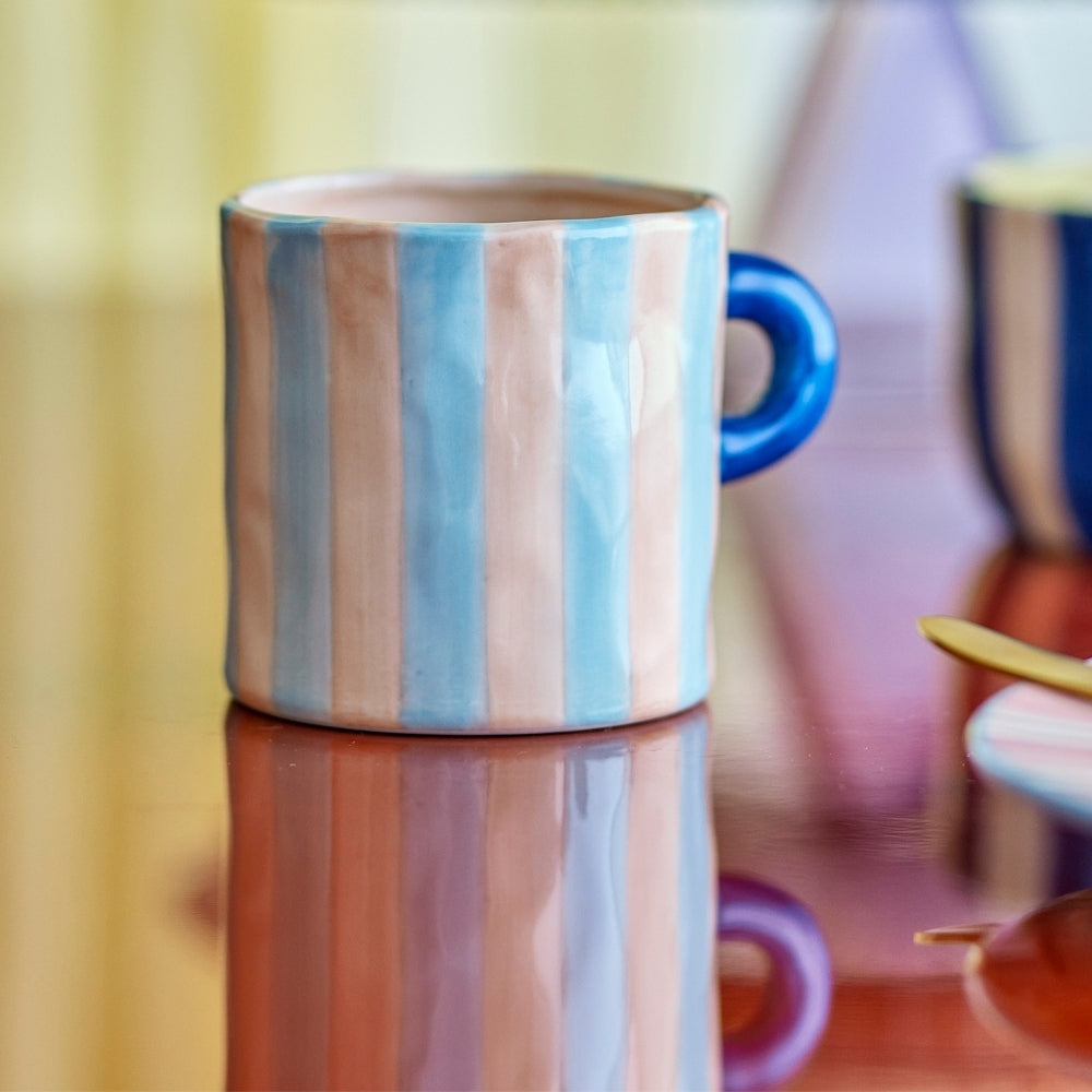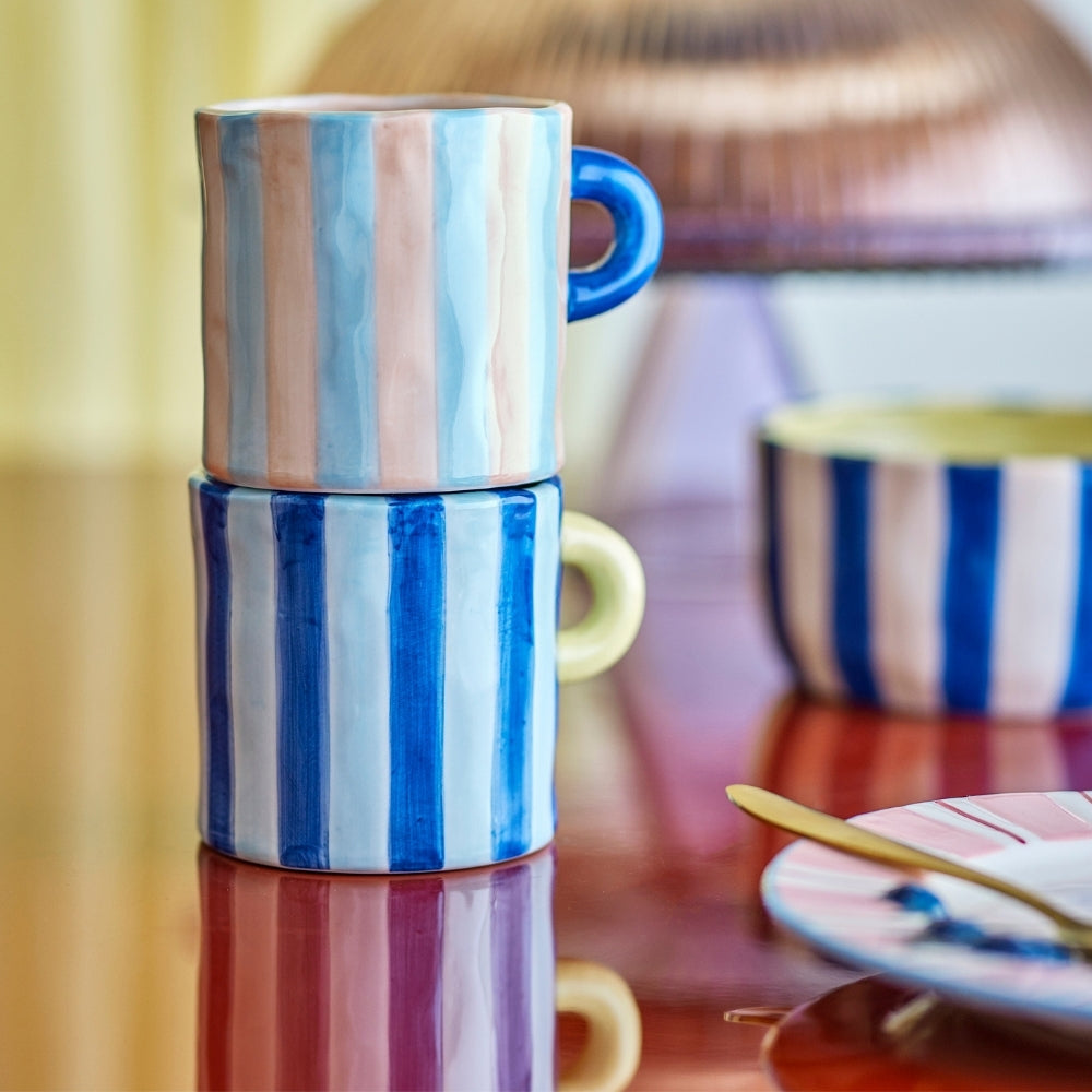 Dungile pictate manual în nuanțe diferite fac ca fiecare cană să arate ușor diferit, în timp ce finisajul lucios și mânerele colorate adaugă o notă ușoară și modernă.