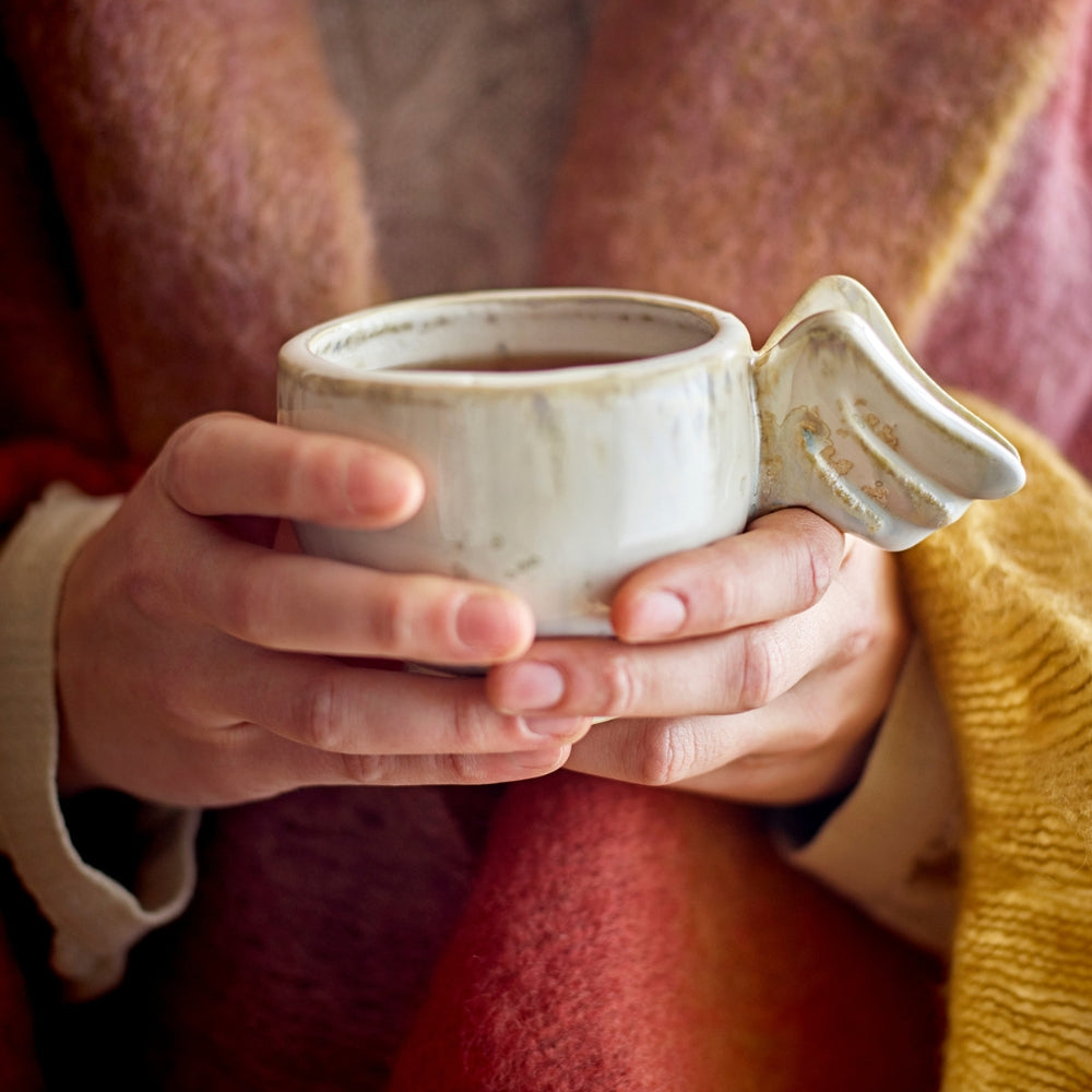 Mânerul în formă de aripă de înger îi conferă un farmec unic, iar culorile moi, naturale fac cana potrivită pentru multe interioare și stiluri.