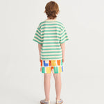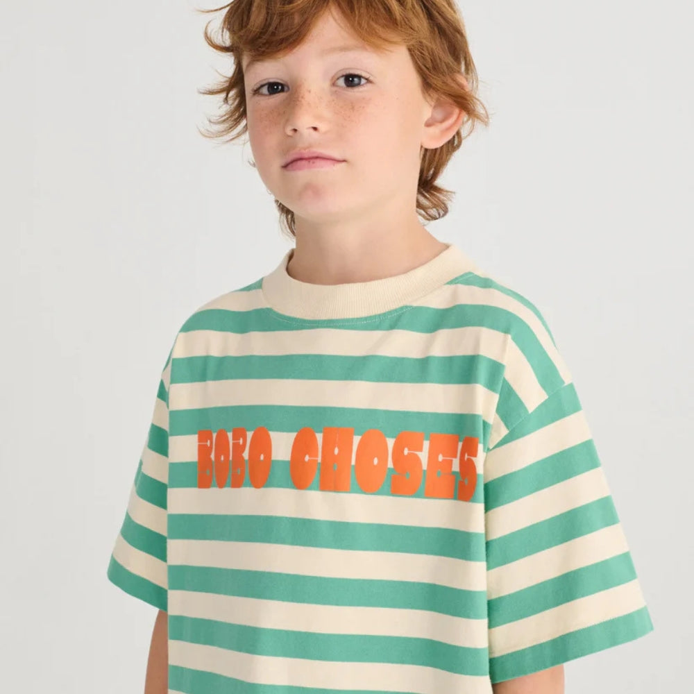 Tricoul pentru copii Bobo Choses este un model izbitor care atrage imediat atenția prin imprimeul colorat, artistic și modelul în dungi.