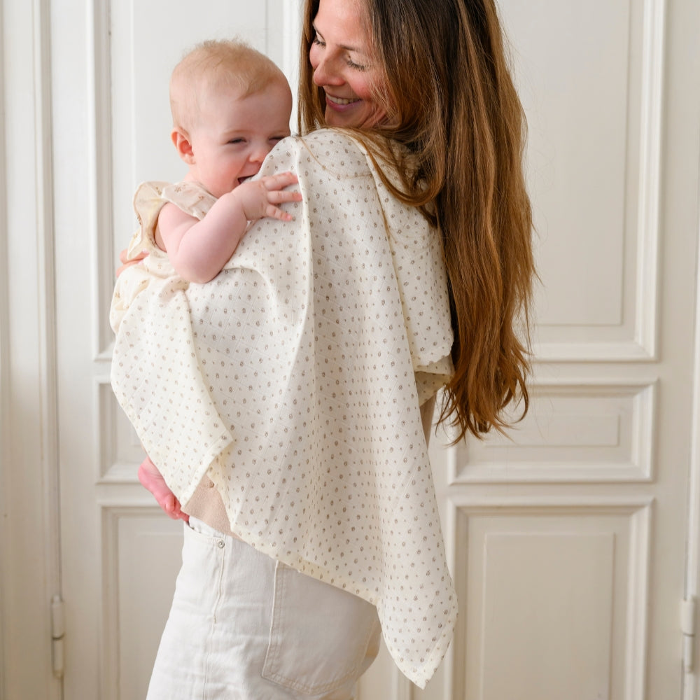 Datorită dimensiunii sale mari de 120x120 cm, va funcționa bine și ca pătură ușoară, cearșaf pentru cărucior sau husă de hrănire.