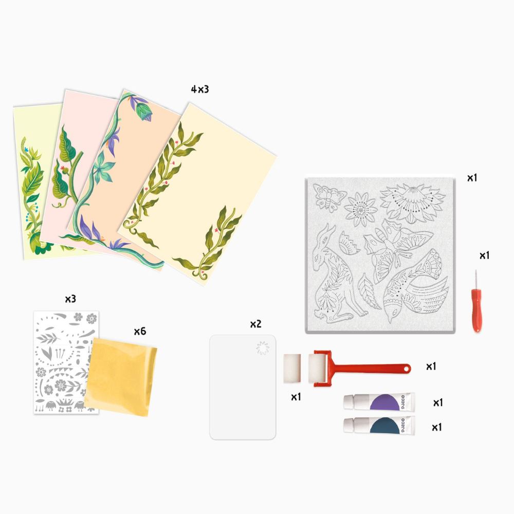 - Conținutul setului: 12 cartonașe ilustrate cu un motiv floral, 8 ștampile de gravat, 1 perforator, 2 tuburi de vopsea guașe, 2 role de spumă, 2 palete, 6 foi de folie de transfer, 3 foi cu modele