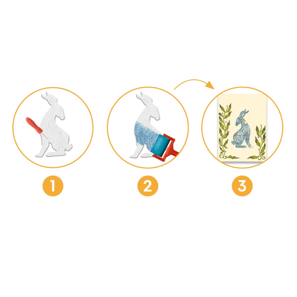 Setul de gravură creativă cu ștampile de la Djeco introduce copilul în lumea gravurii într-un mod sigur și interesant.