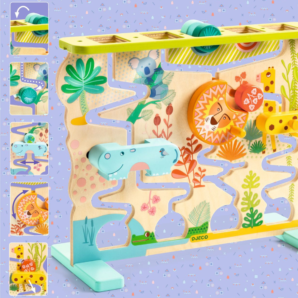 Pentru a elibera discurile și a le lăsa să cadă pe "cascadă", copilul întoarce coama leului, ridică girafa sau împinge hipopotamul.