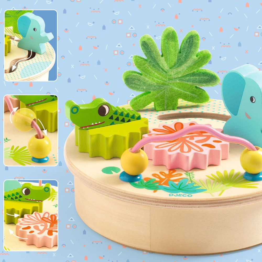 Pe partea de sus a mesei rotunde veți găsi mărgele care alunecă, un elefant care se ascunde în spatele tufișurilor și unelte de crocodil.