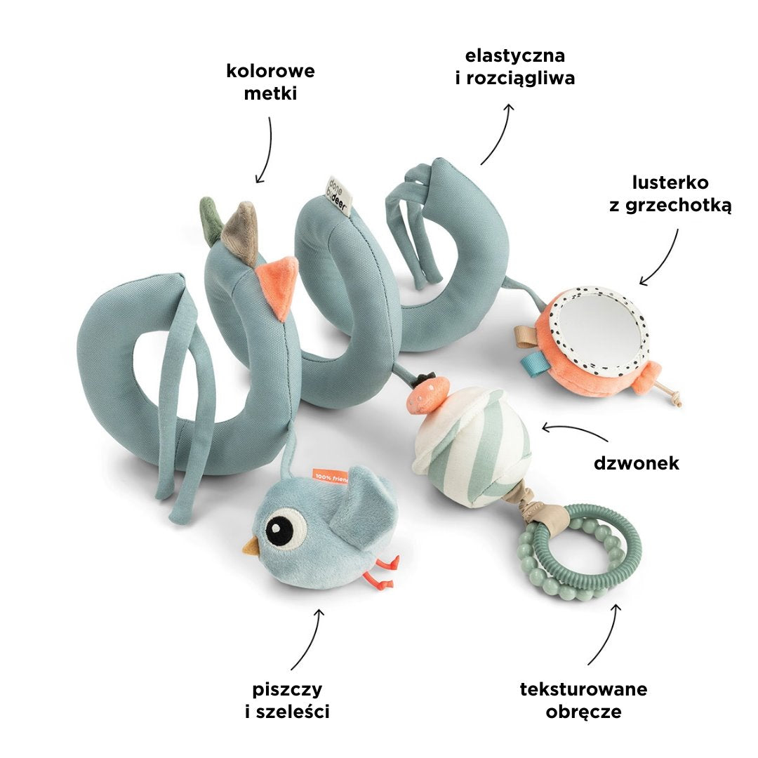 Pandantivul pentru cărucior Done by Deer în formă de spirală este partenerul perfect pentru explorarea senzorială a micuțului dvs. în afara casei.