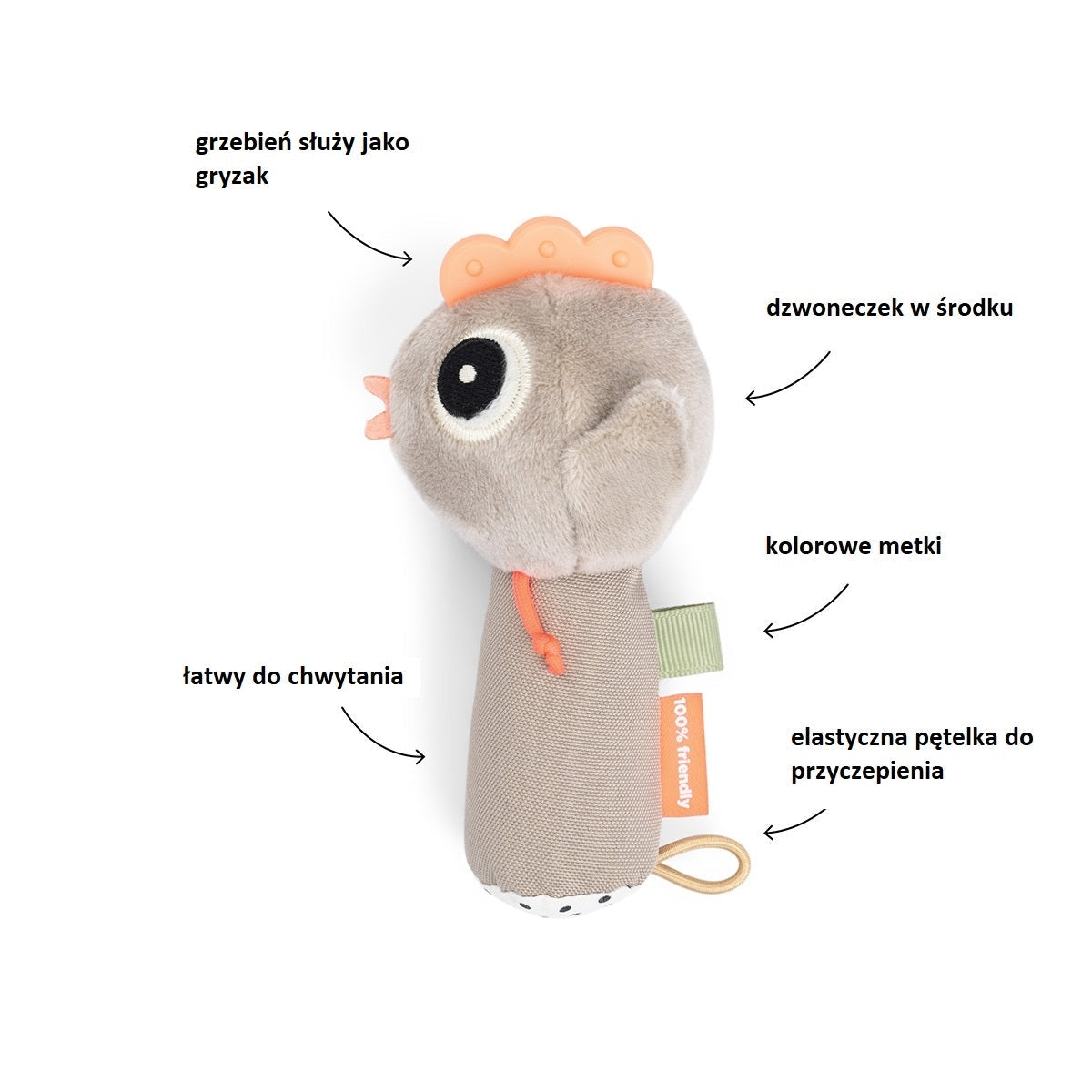 Zornăitorul de la Done by Deer este o jucărie senzorială adorabilă în formă de cocoș, creată cu gândul la cei mai mici copii.