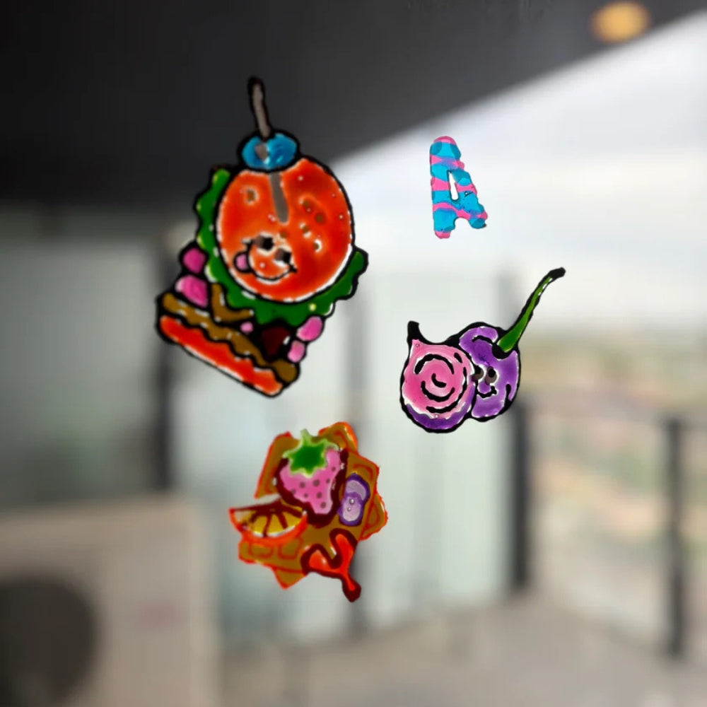 Pur și simplu conturați o formă, umpleți-o cu culoare, așteptați să se usuce și dezlipiți-o pentru a crea un decor strălucitor care poate fi lipit pe o fereastră, oglindă, sticlă sau alte suprafețe netede.