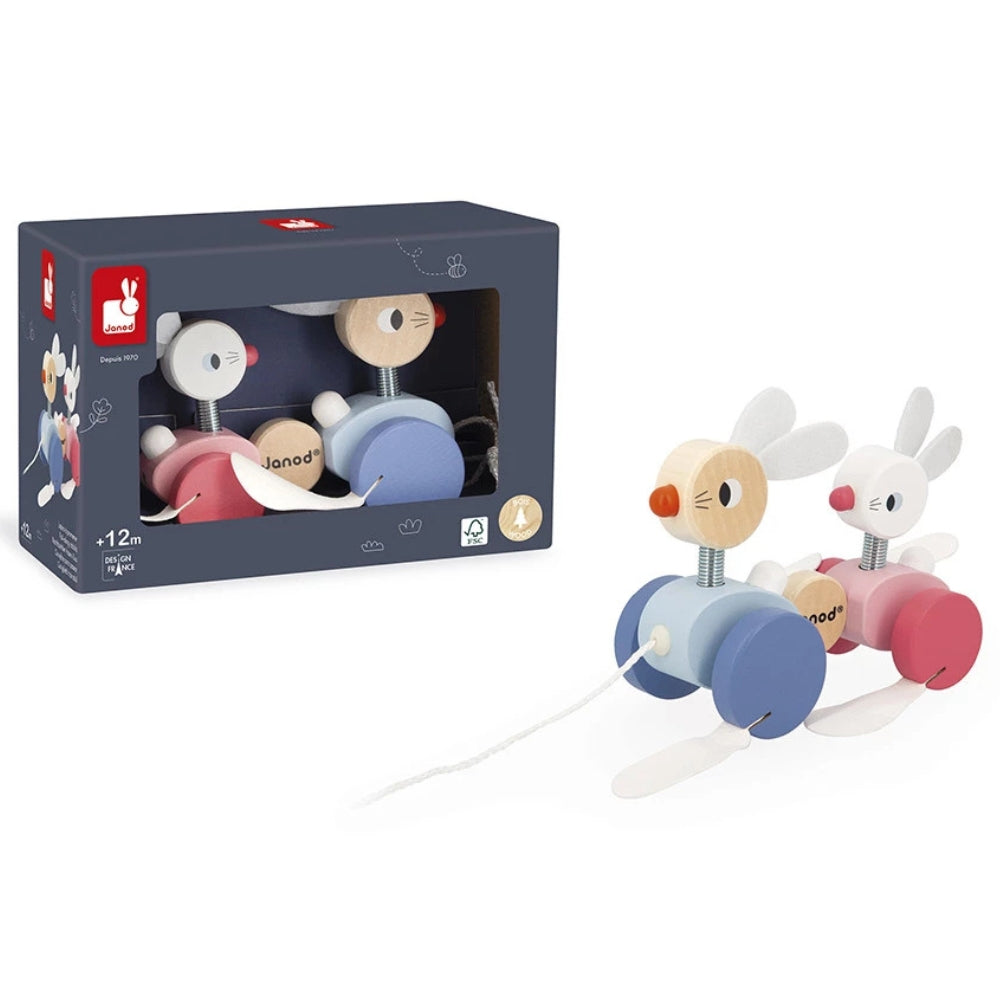 Jucăria de tras Janod este o familie adorabilă de iepurași pe care un copil mic o poate lua oriunde.