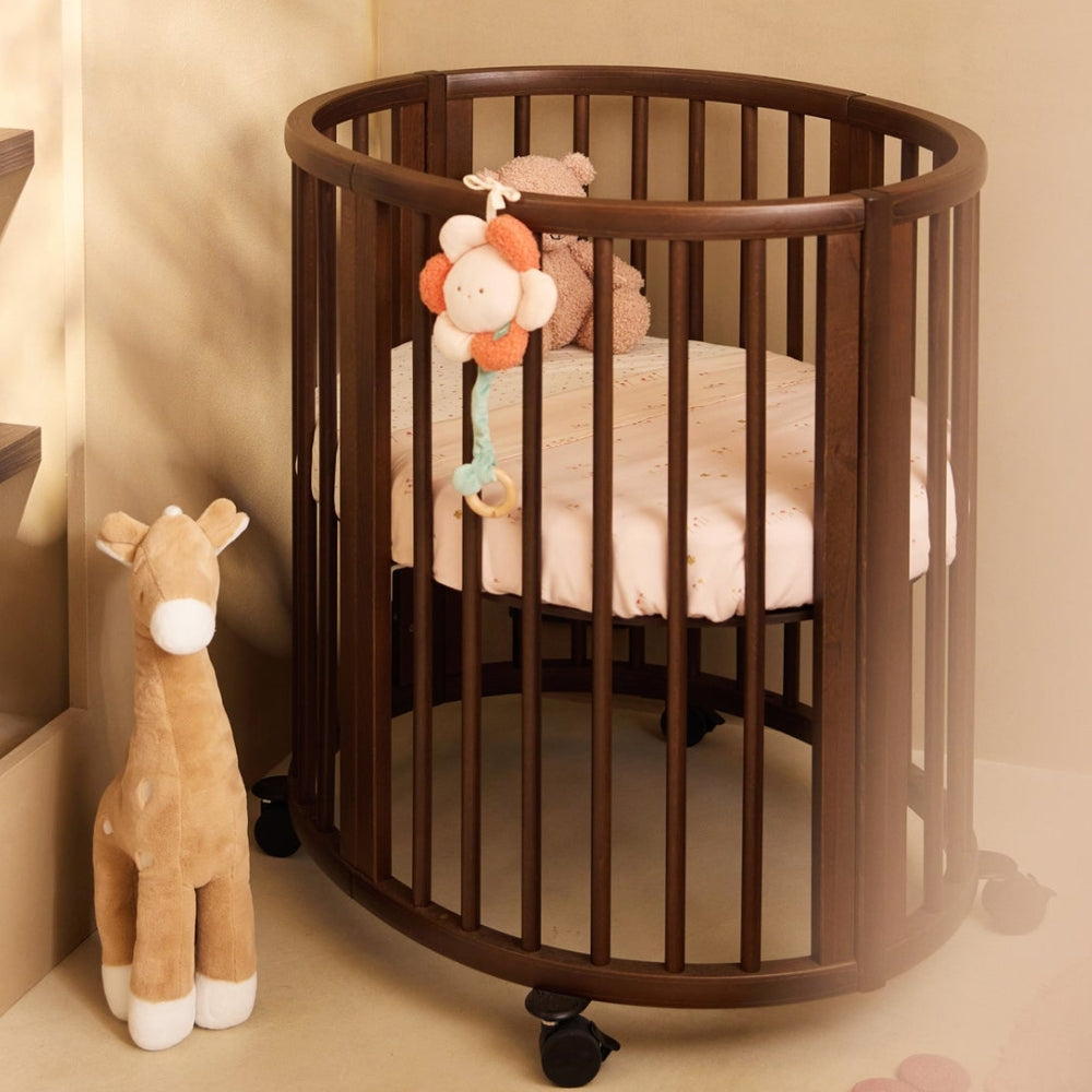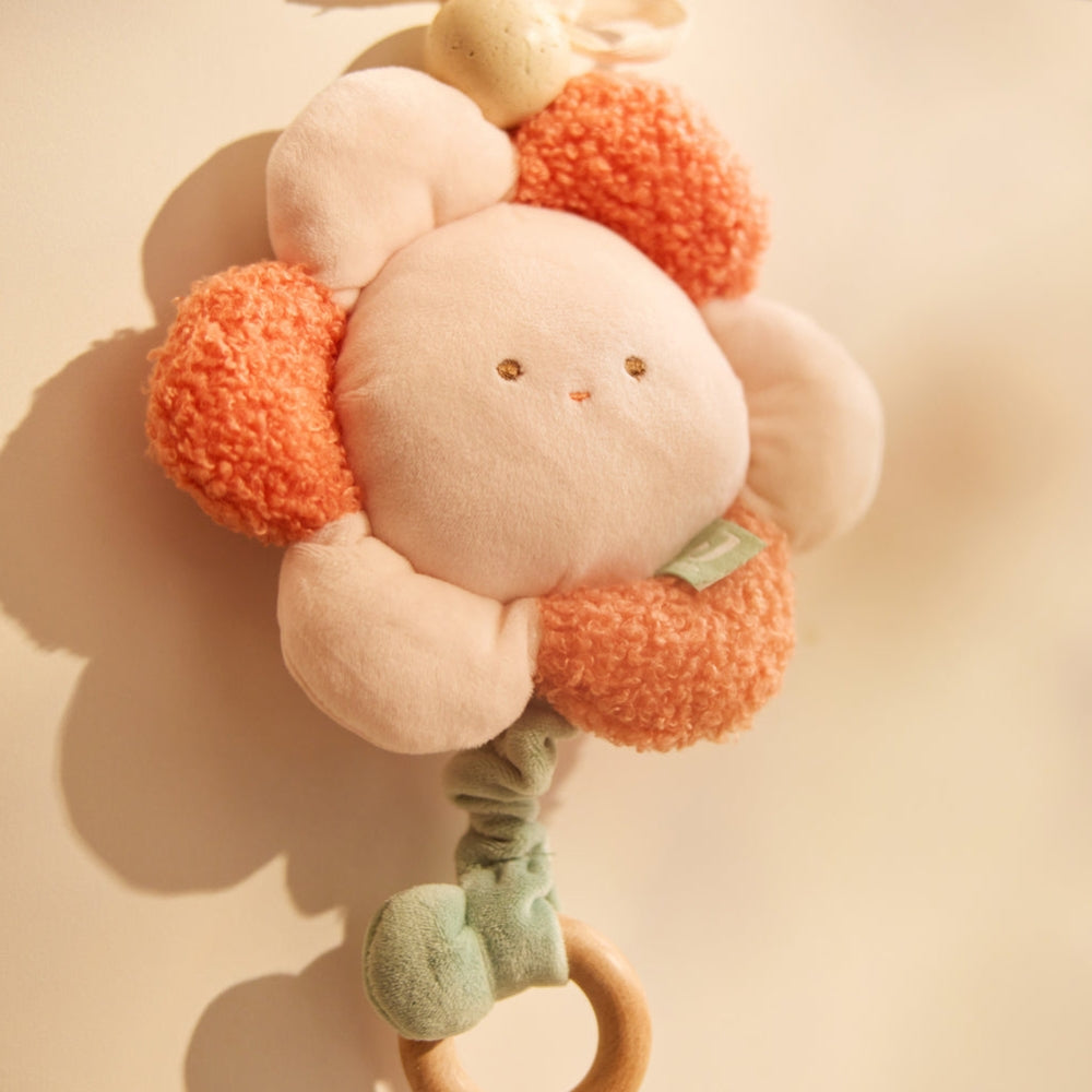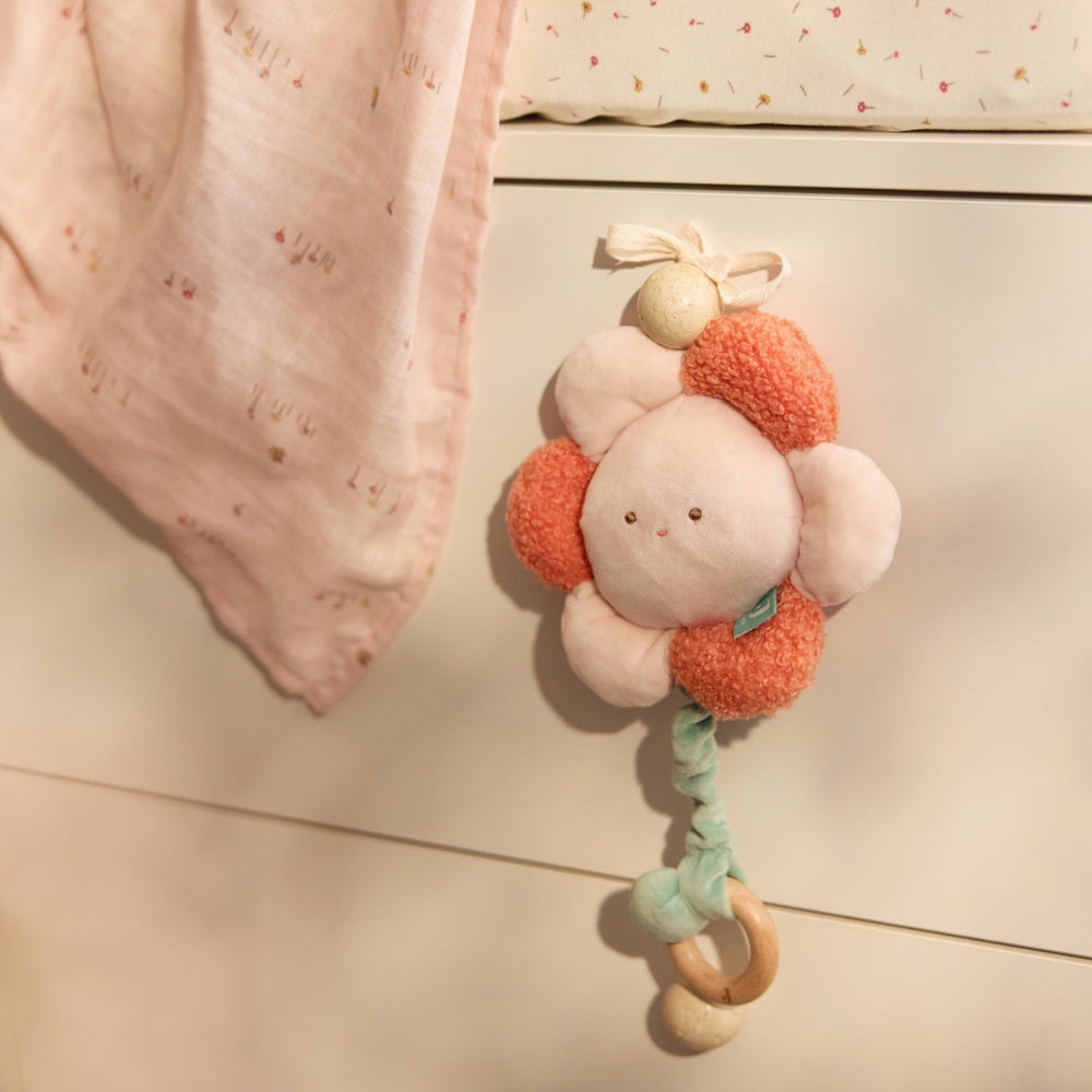 Floarea moale din material plăcut de buclă și catifea se mișcă ușor în jurul căruciorului, pătuțului sau scaunului de mașină.