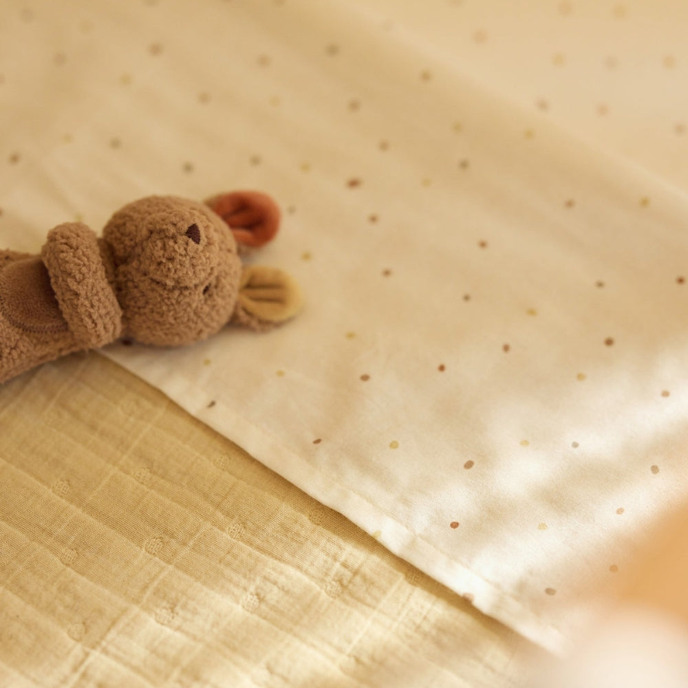 Lâna moale de coral și catifeaua fac ca Jollein să se potrivească bine în mânuțele micuților și sunt plăcute la atingere.
