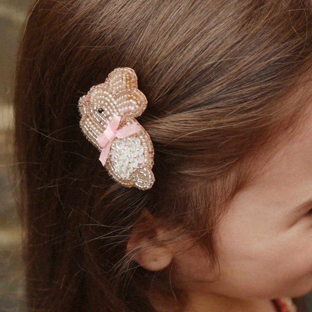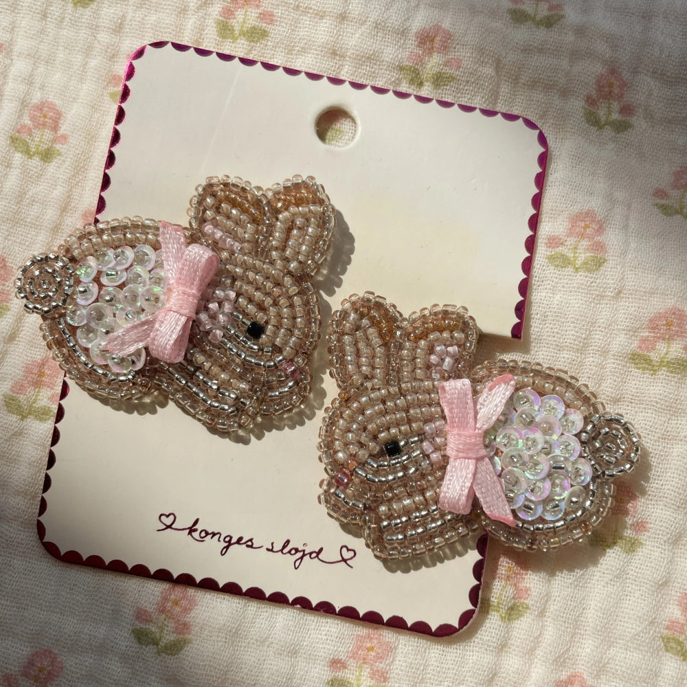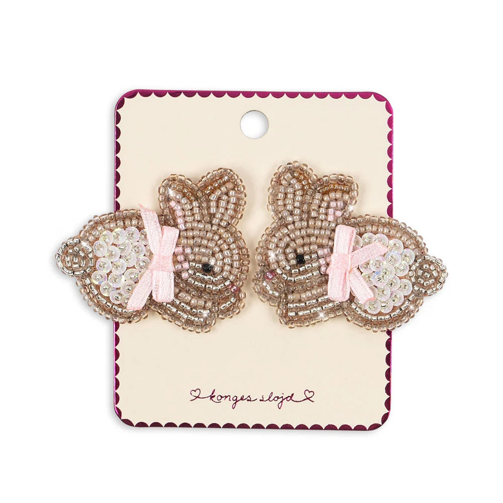Agrafele de păr Konges Slojd în formă de iepurași adorabili sunt un accesoriu unic care va accentua subtil coafura oricărui copil.