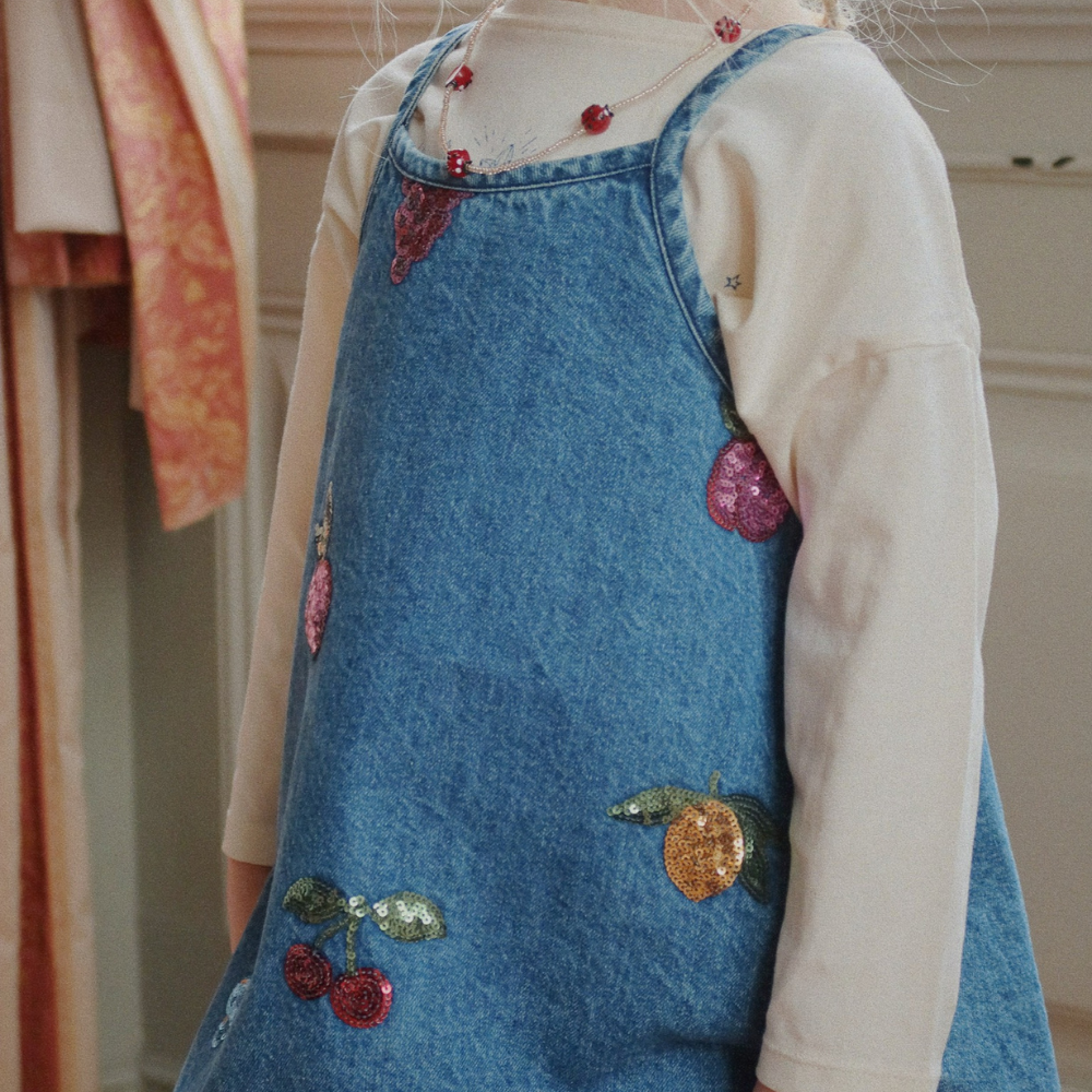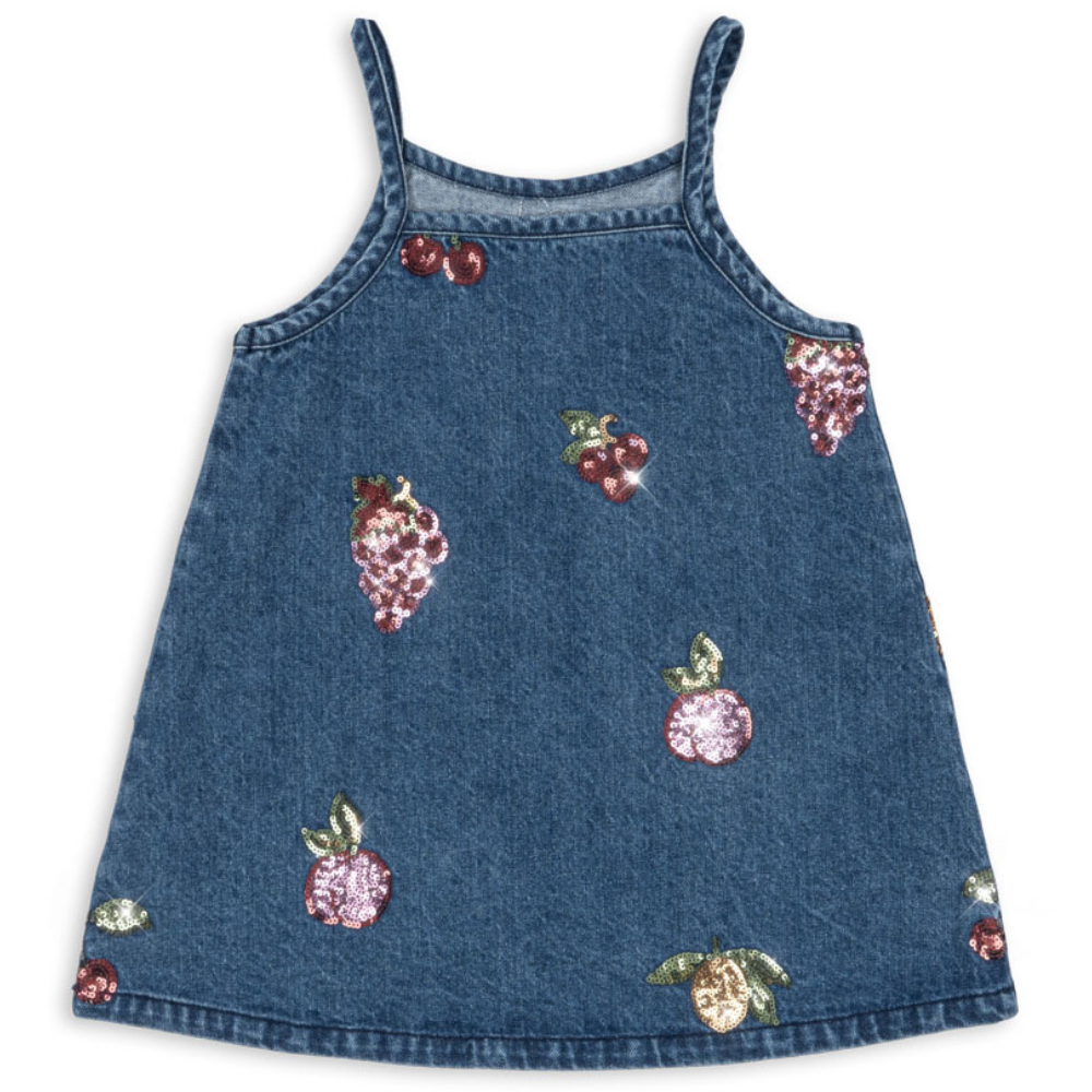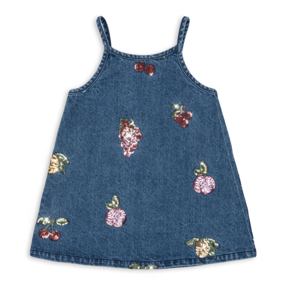 Această rochie din denim pentru copii de la Konges Slojd impresionează prin strălucirea sa subtilă - fructele brodate și cu paiete îi sporesc farmecul și conferă oricărei ținute un aer estival și jucăuș.