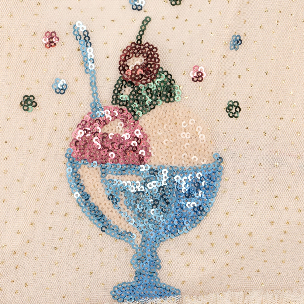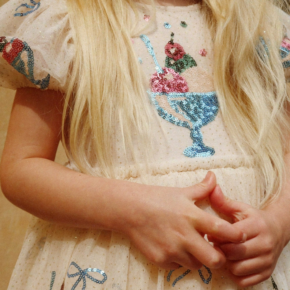 Modelul este decorat cu broderie decorativă cu paiete, care îi conferă o notă elegantă, fără a-și pierde ușurința copilărească.