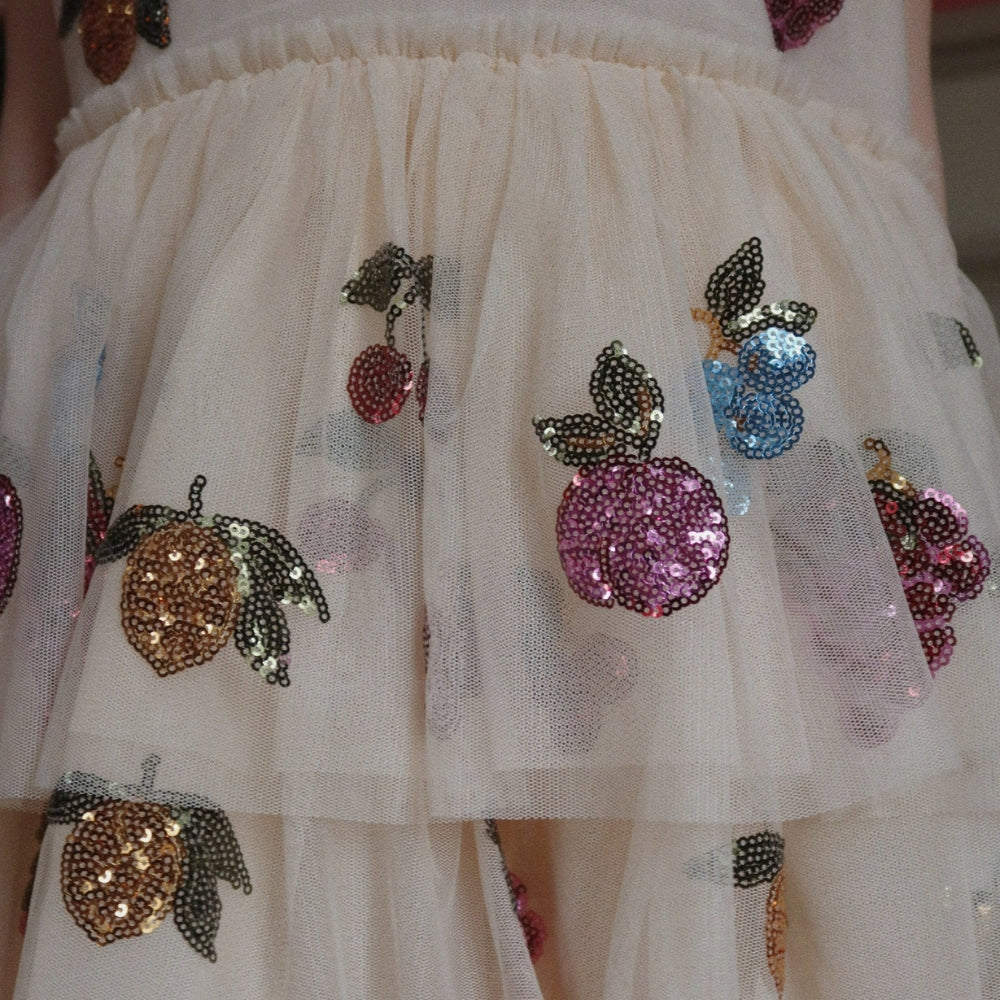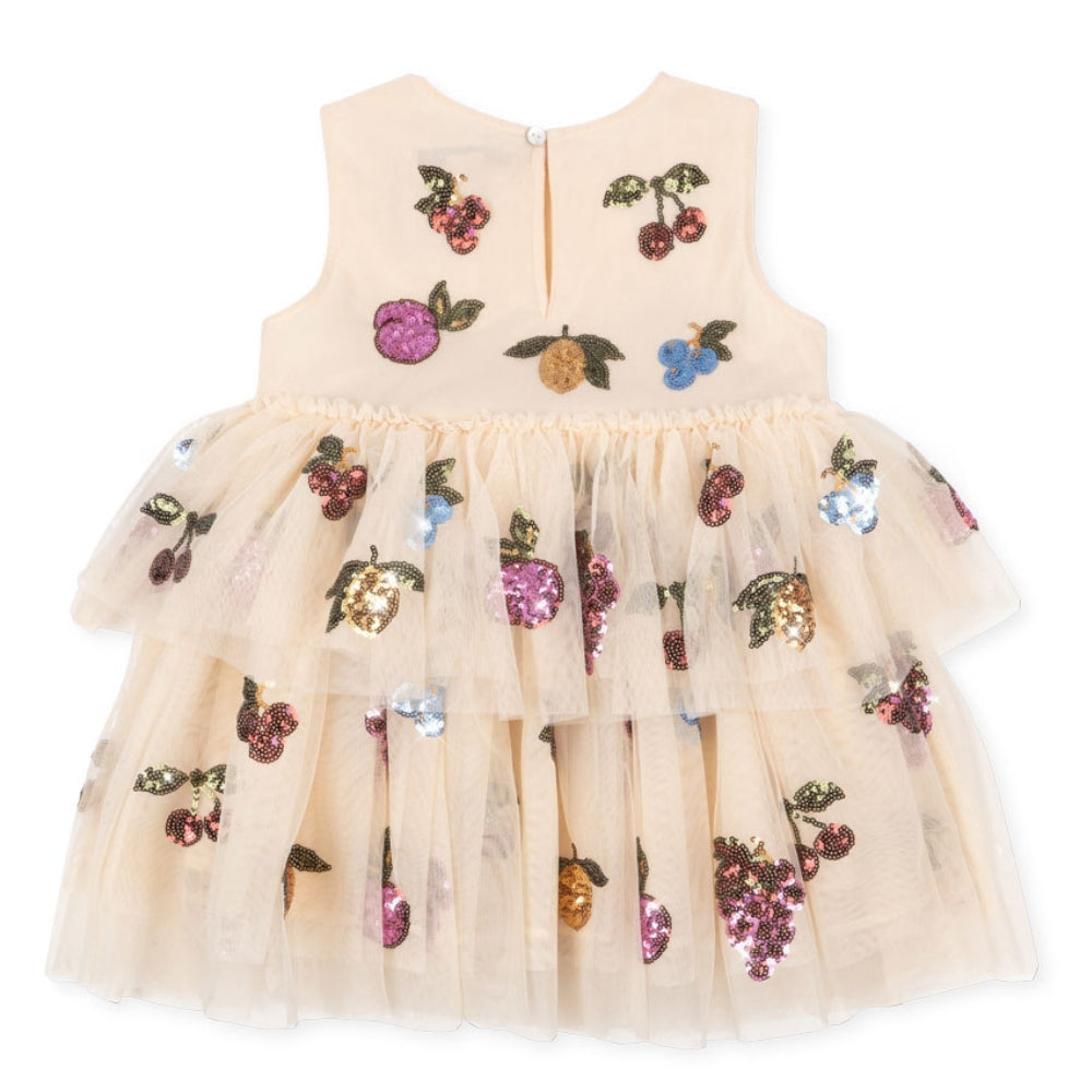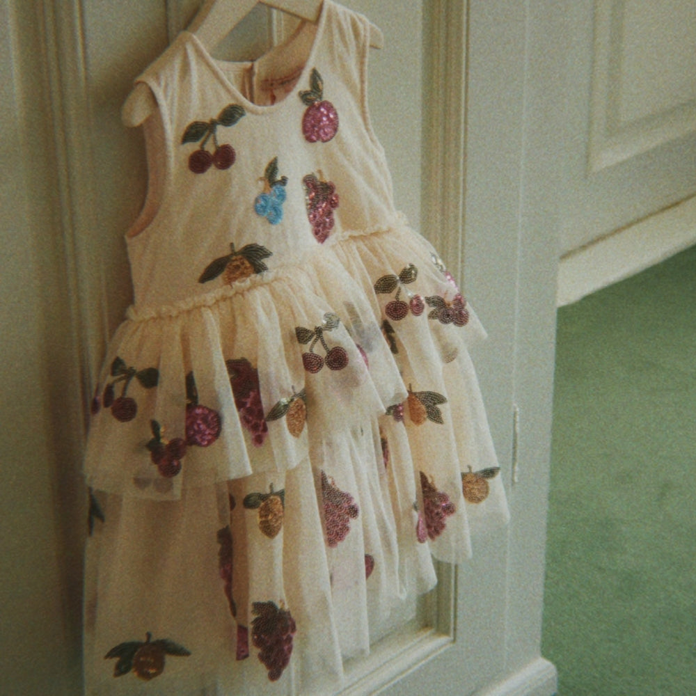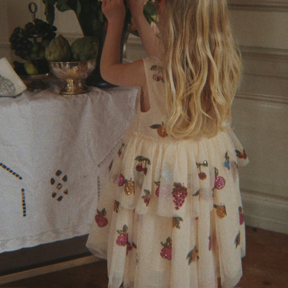 Rochia pentru fete Yvonne de la Konges Slojd este o opțiune strălucitoare, inspirată din basme, pentru micile zâne care adoră să danseze și să se rotească.