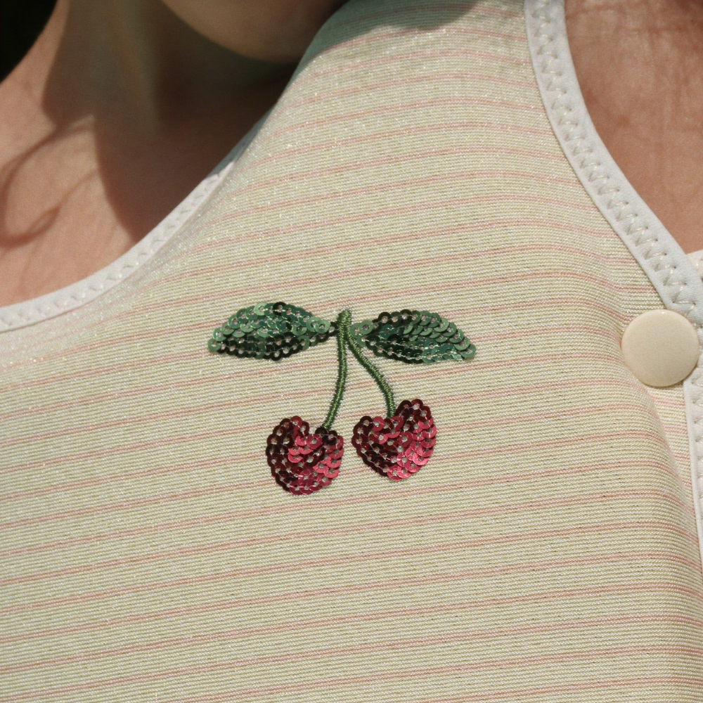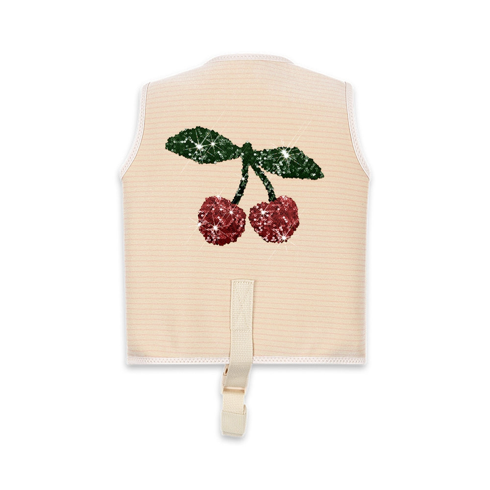 Vesta de înot cu motivul adorabil de cireșe este suportul perfect pentru un copil mic care începe să se obișnuiască cu apa.