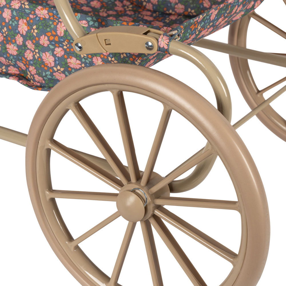 Acest cărucior de păpuși elegant duce distracția în lumea stilului vintage: patru roți mari, țesătură moale matlasată, ornamente subtile ondulate și o saltea confortabilă creează un spațiu confortabil pentru păpușa ta preferată.