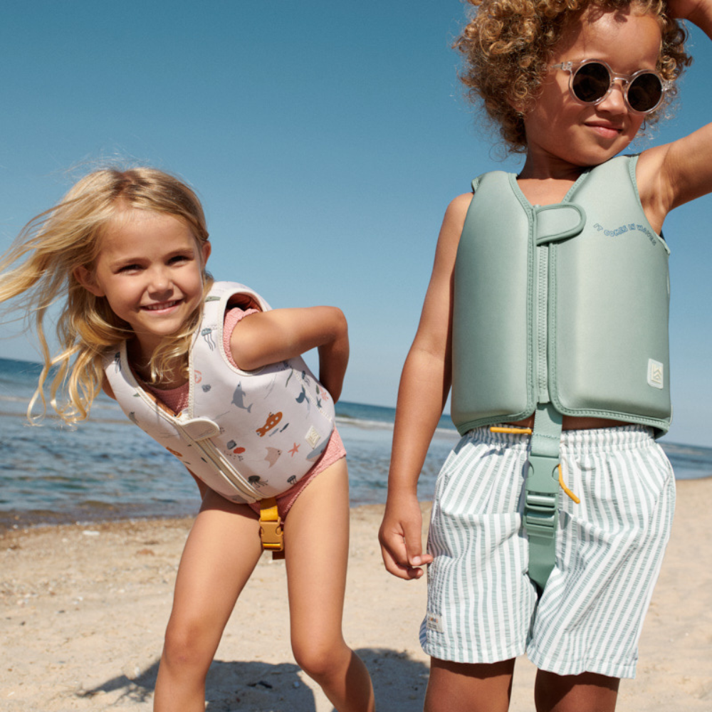 Giletca de înot Liewood în modele vesele de vară îi ajută pe cei mici să se obișnuiască cu apa și să se simtă mai încrezători în timpul primelor lor jocuri în piscină sau pe malul mării.