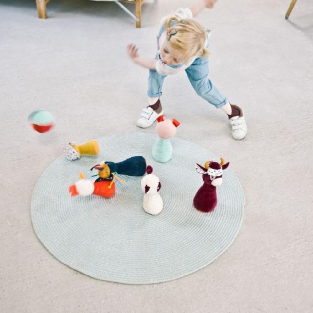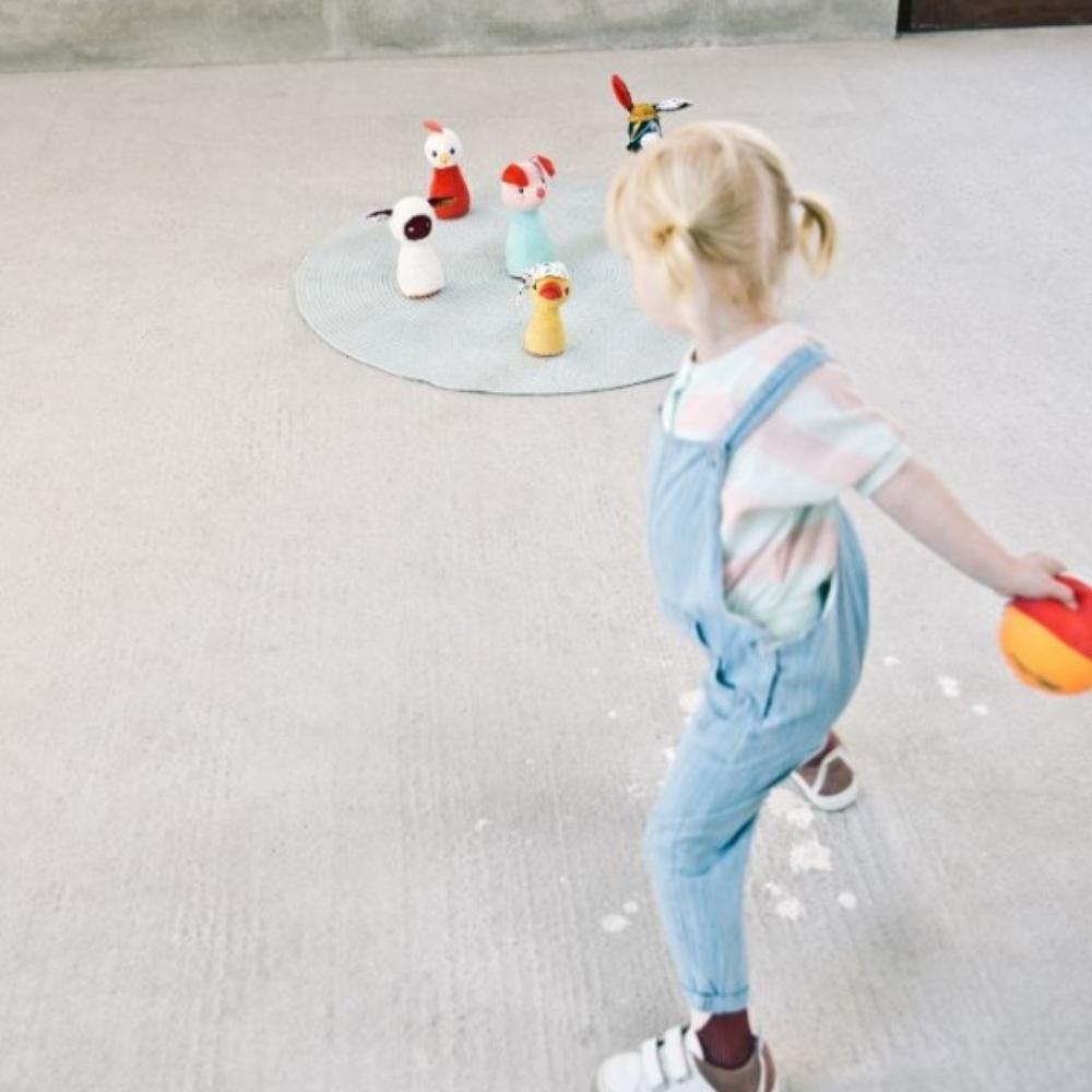 Das Glockenball-Bowling aus der neuen Farm-Kollektion der belgischen Marke Lilliputiens ist ein außergewöhnliches Entwicklungsspielzeug für kleine Kinder.