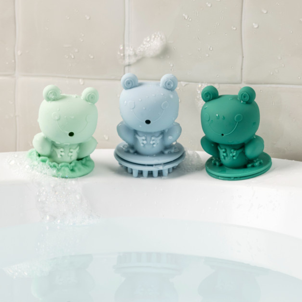 Aceste jucării de baie îl implică pe micuțul dvs. în mai multe moduri: broasca verde închis stropește cu apă, figurina albastră are file și găuri plăcute, de masaj, pentru a crea o "ploaie" blândă, iar cea verde deschis - când se adaugă puțin săpun - face o spumă spectaculoasă cu bule.