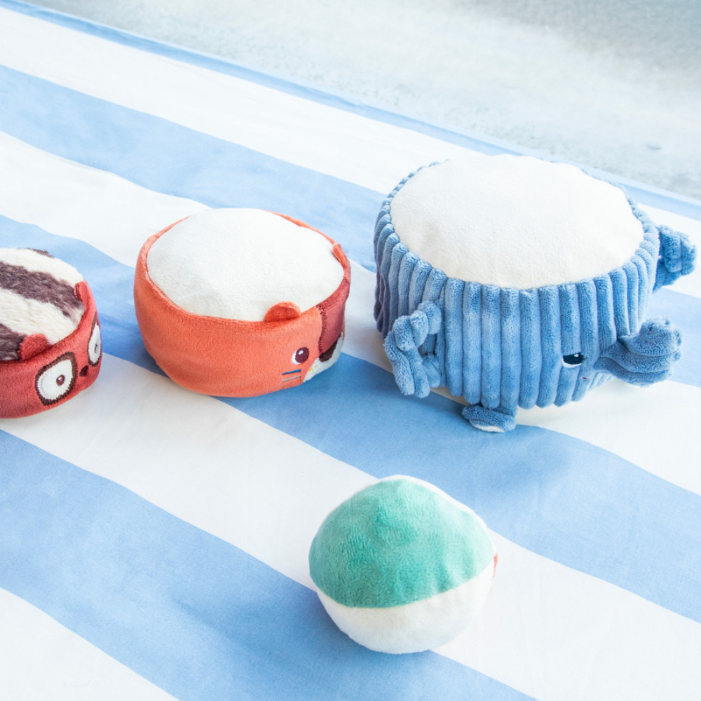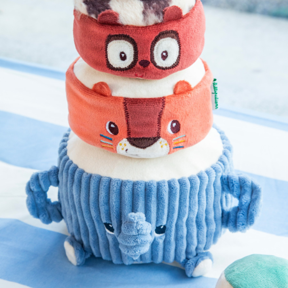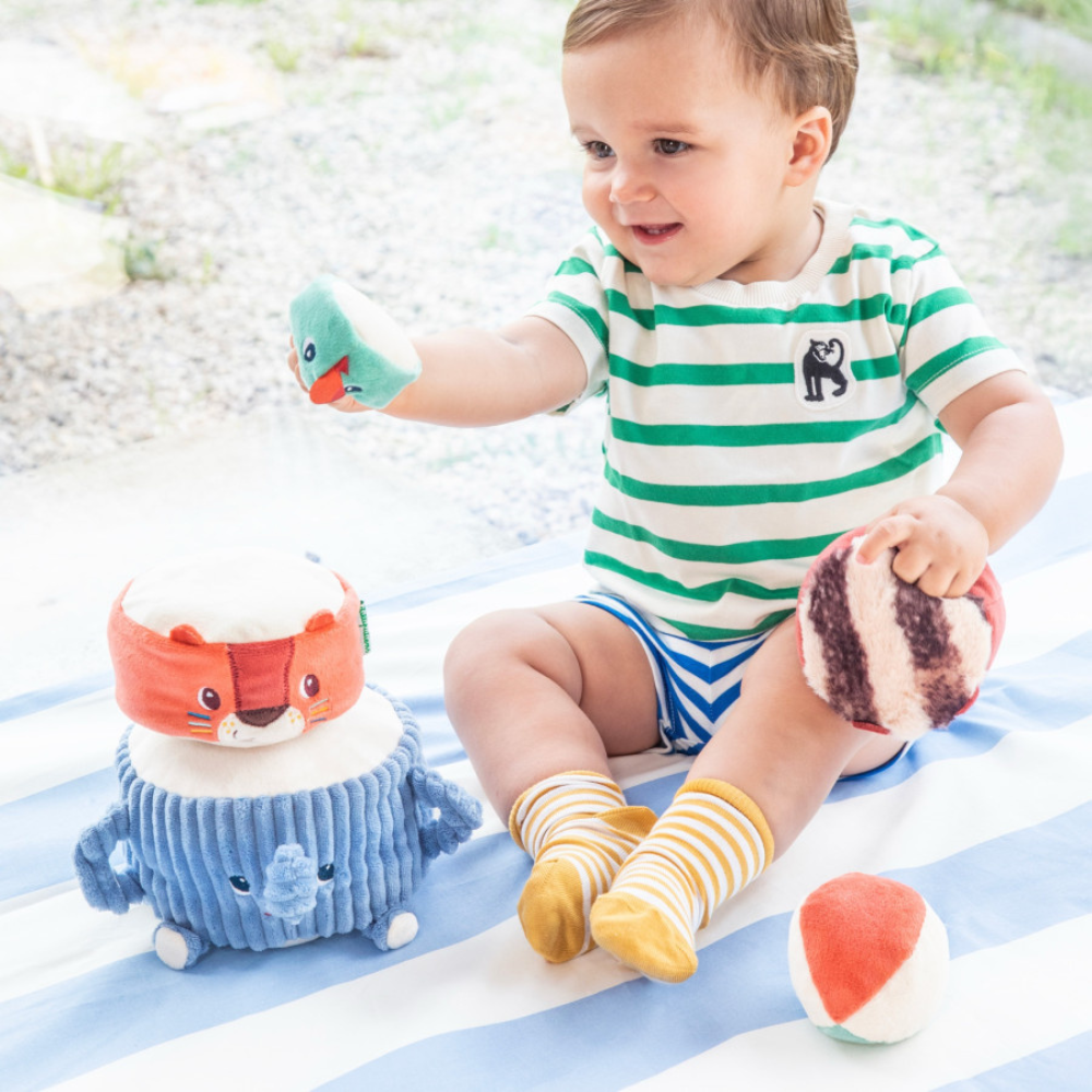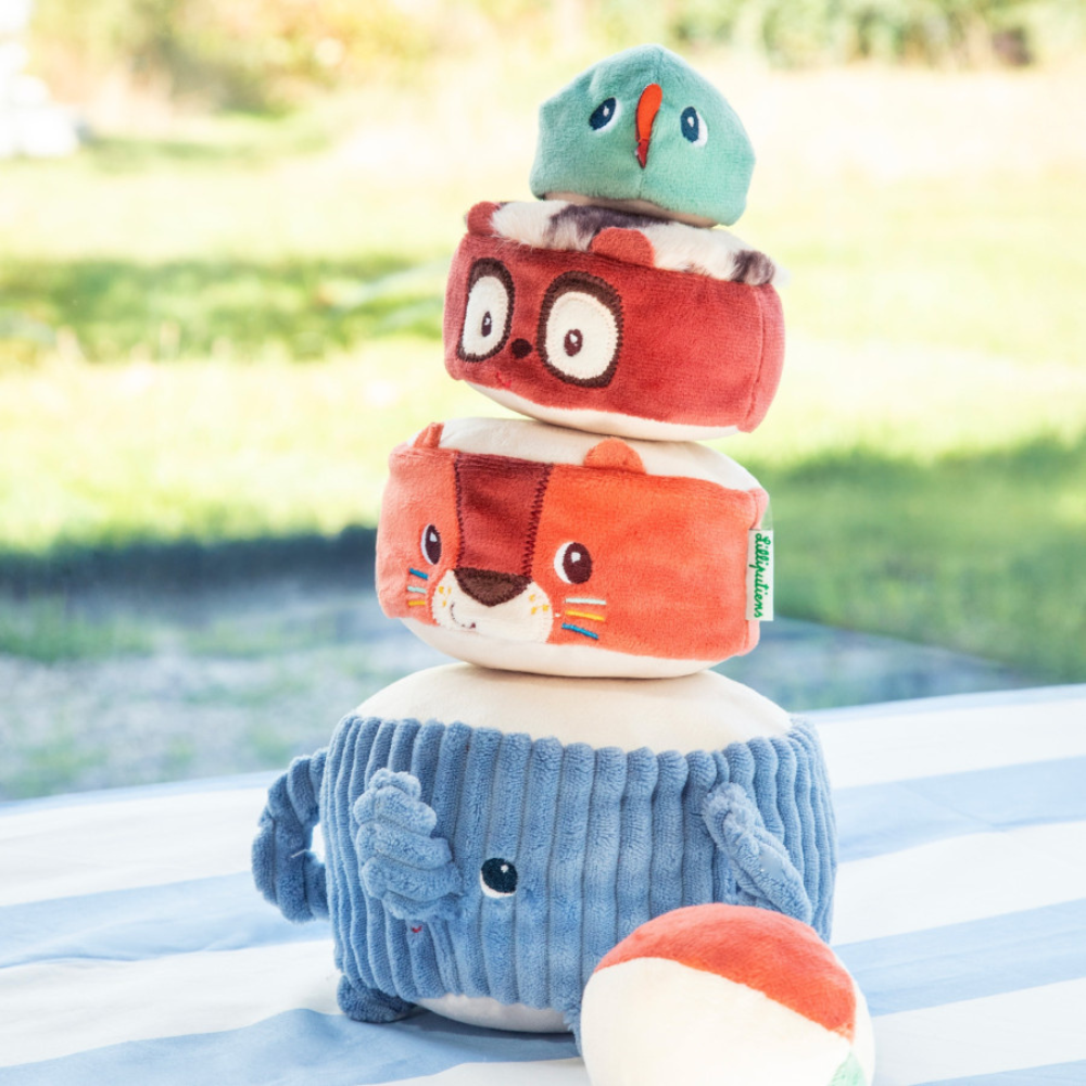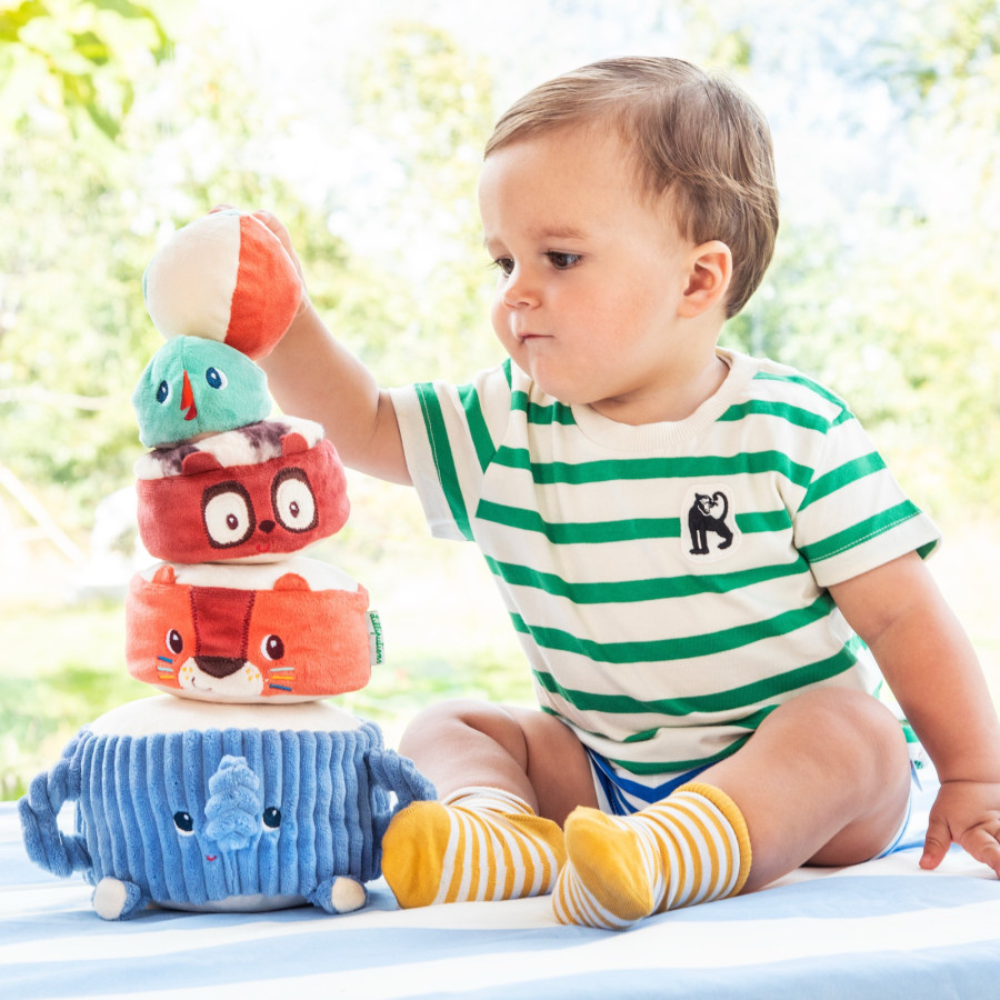 Piramida sonoră cu animale moi de la Lilliputiens este o jucărie care îi atrage pe cei mici în lumea acrobaților de la 12 luni.