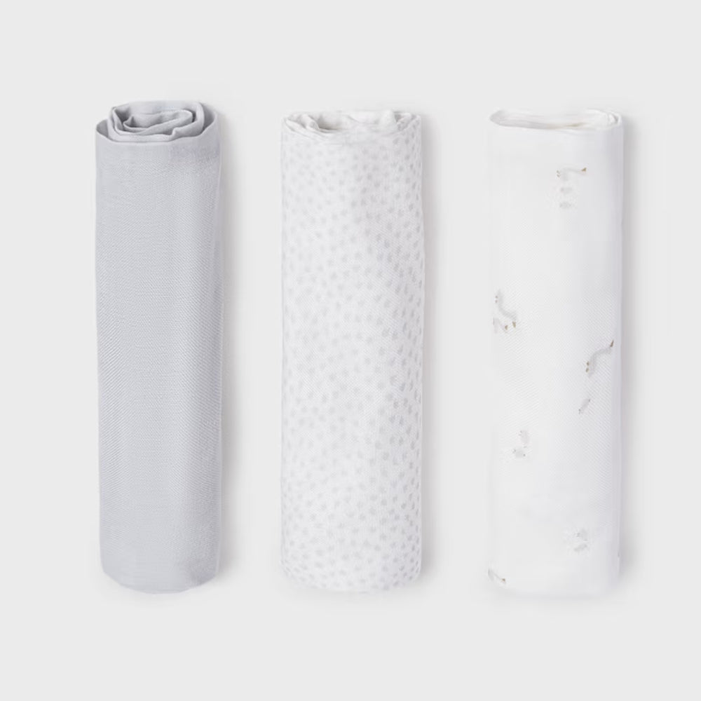 • Conținutul setului: 3 scutece de tifon în nuanțe de alb și gri