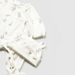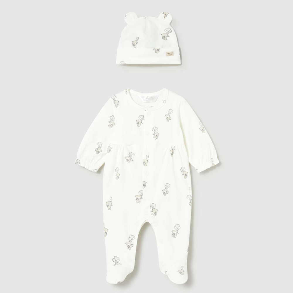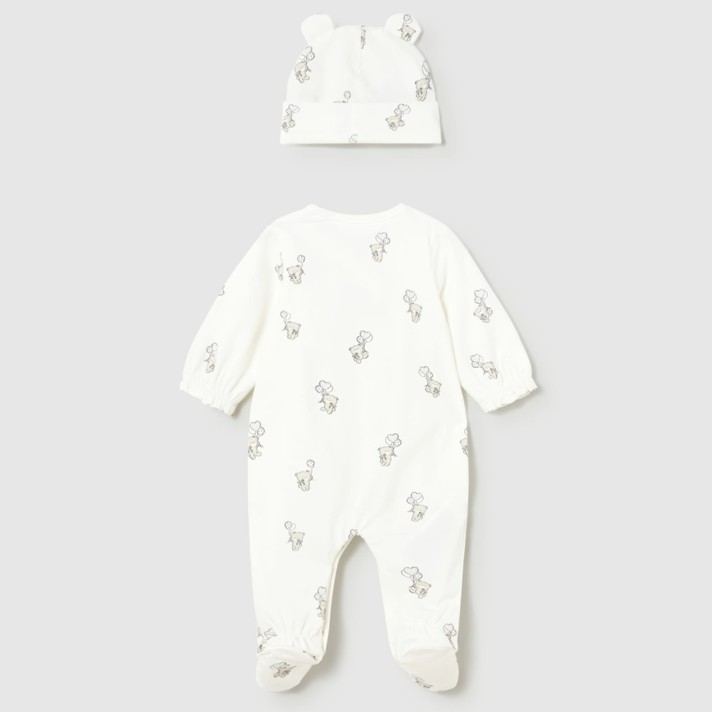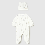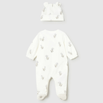 Modelul de pijama cu șapcă asortată învelește frumos corpul bebelușului și îi oferă un sentiment de siguranță.