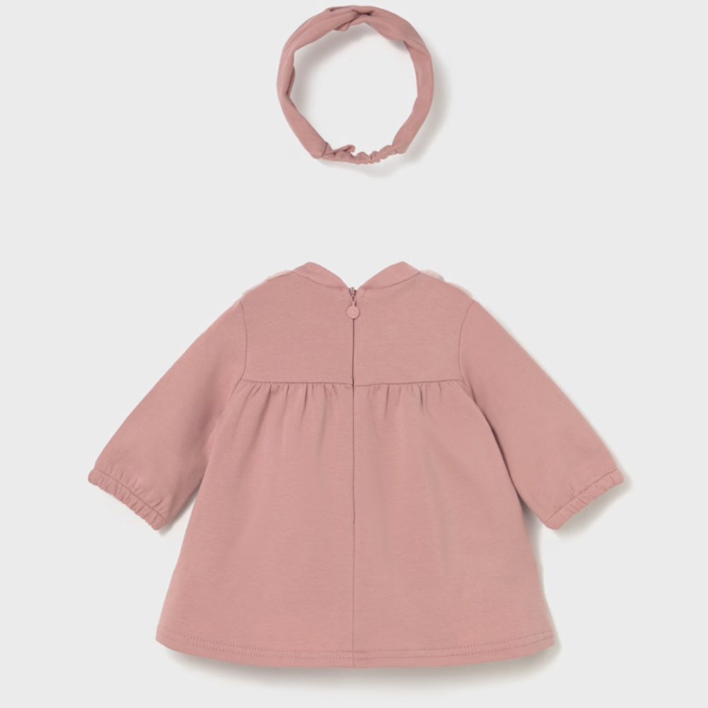 Setul pentru nou-născut Mayoral cu rochie și bentiță este un set delicat pentru primele ieșiri, întâlniri de familie și fotografii suvenir.