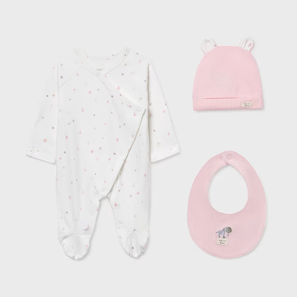 Este alegerea perfectă pentru un baby shower, nașterea unui copil sau orice altă ocazie specială. Setul cadou pentru bebeluși de la Mayoral conține trei articole esențiale: un costum de dormit delicat, o pălărie și o bavetă - tot ce are nevoie un nou-născut pentru un somn confortabil și liniștit.