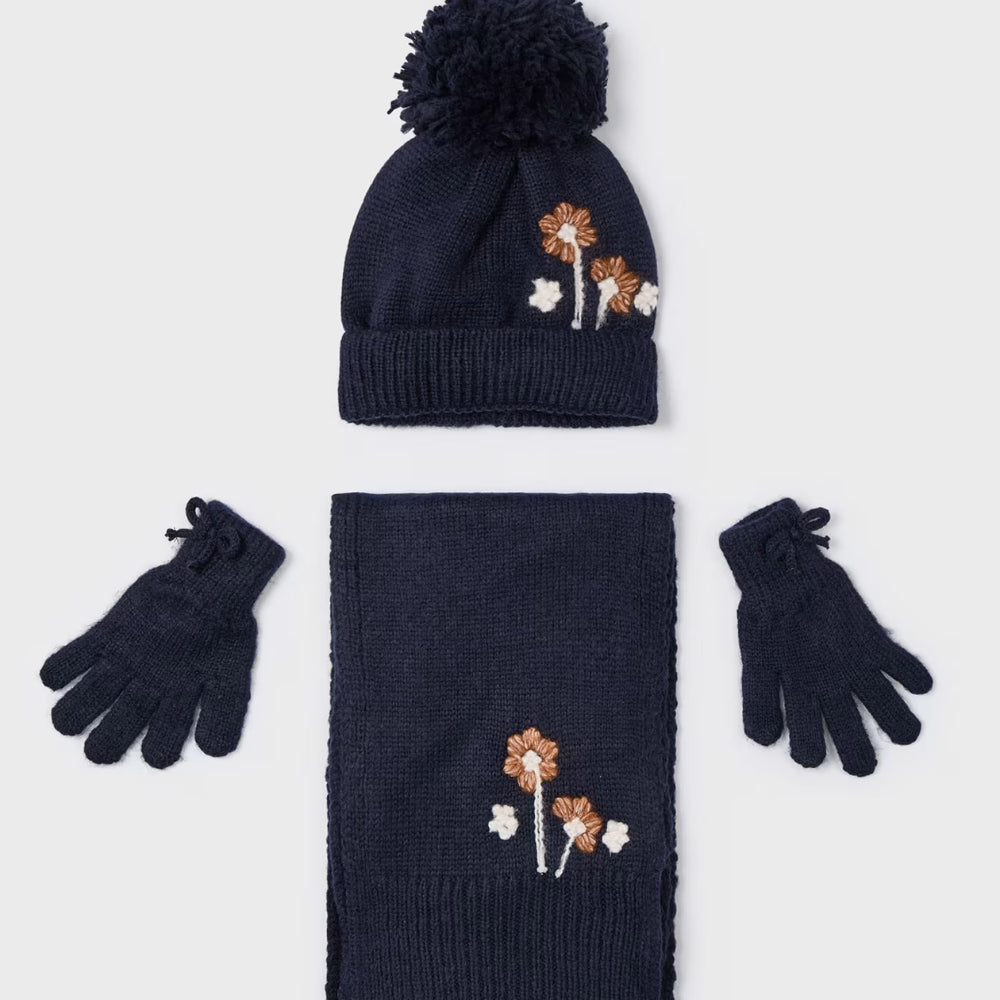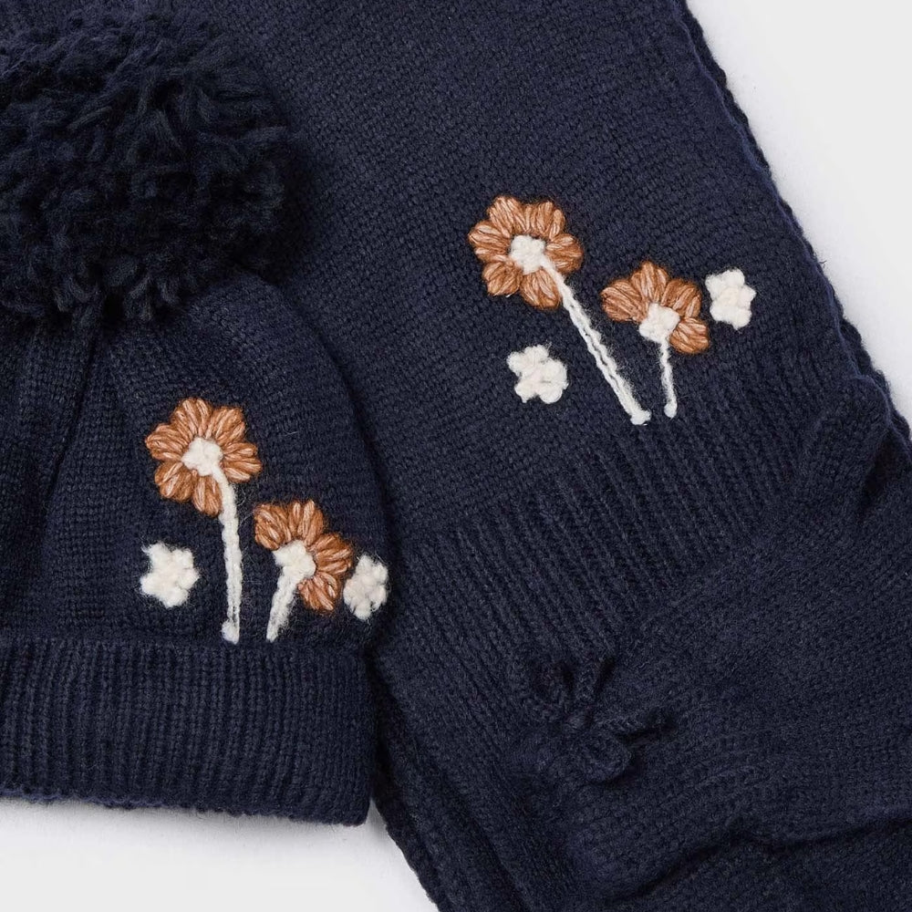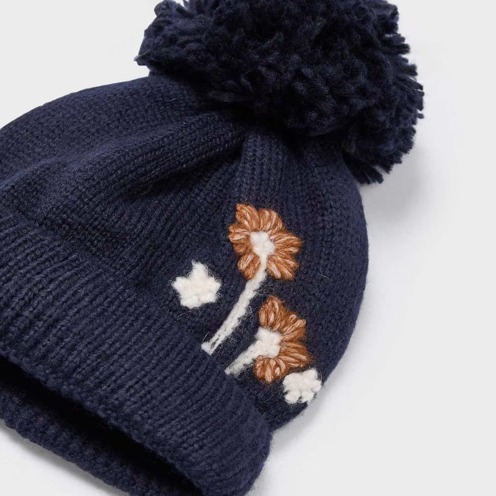 Pălăria cu un pompon drăguț și eșarfa au fost decorate cu un motiv floral subtil, care contribuie la farmecul general feminin.