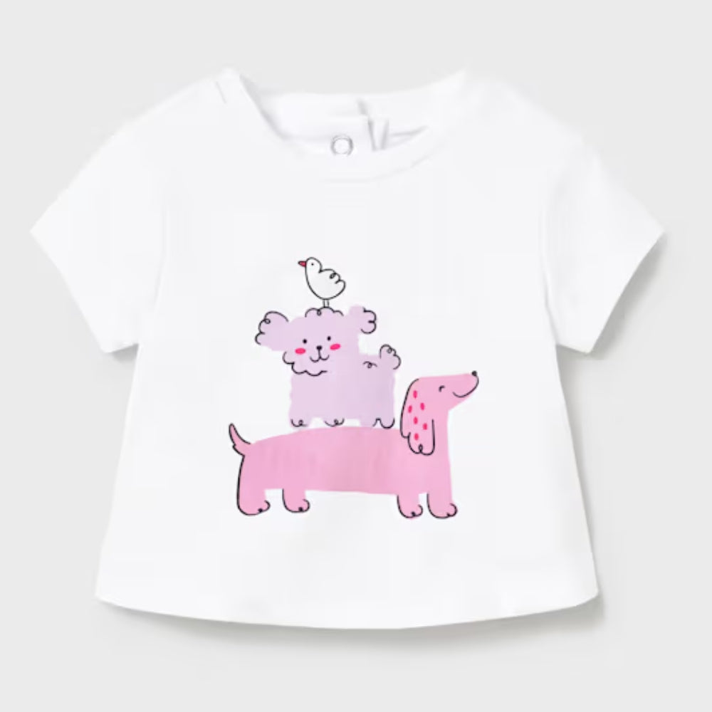 Tricoul cu mânecă scurtă este decorat cu motive de căței, care introduce o notă distractivă și prietenoasă.