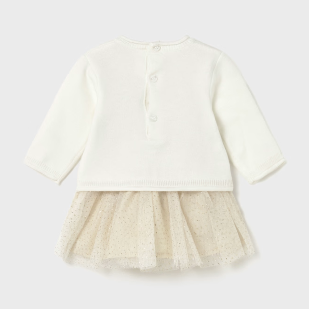 Set nou-născut cu pulover și rochie de la Mayoral.